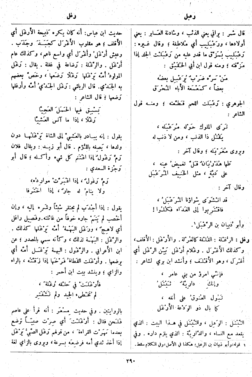 يَقُولُ: إِذا أَجْدَب لَمْ يَحْتَقِرْ شَيْئًا وشَرِه إِليه، وإِن أَخْصب لَمْ يَنَم جَارُهُ خَوْفًا مِنْ غَائِلَتِهِ. وفَصِيل رَاغِل أَي لاهِجٌ، ورَغَل البَهْمةُ أُمَّه يَرْغَلُها كَذَلِكَ. والرَّغْل: البَهْمة لِذَلِكَ، وكأَنه سُمِّيَ بِالْمَصْدَرِ؛ عَنِ ابْنِ الأَعرابي. والرَّغُول: الْبَهْمَةُ يَرْغَل أُمَّه أَي يَرْضَعُهَا. وأَرْغَلَت القَطاةُ فَرْخَها إِذا زَقَّتْه، بِالرَّاءِ وَالزَّايِ؛ وَيُنْشِدُ بَيْتَ ابْنِ أَحمر: