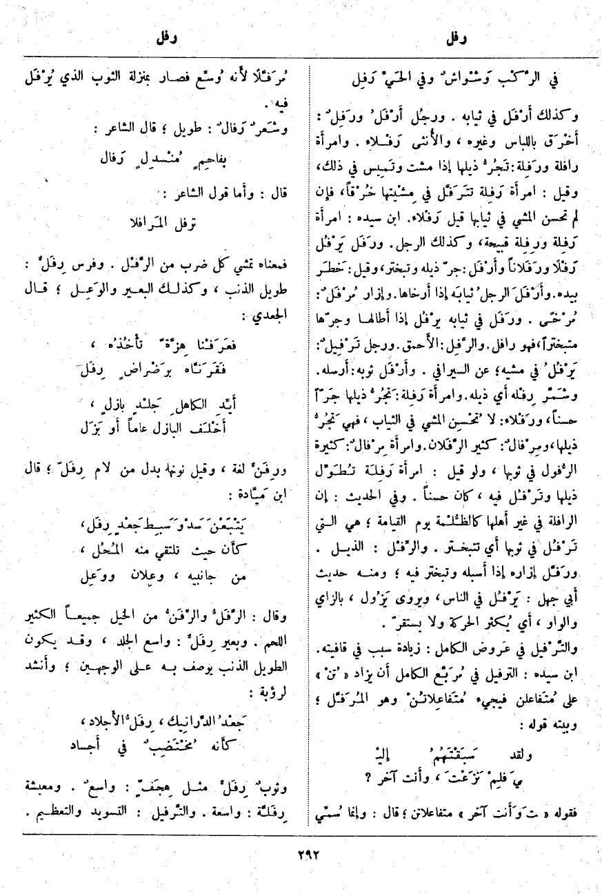 وَكَذَلِكَ أَرْفَلَ فِي ثِيَابِهِ. ورجُل أَرْفَلُ ورَفِلٌ: أَخْرَق بِاللِّبَاسِ وَغَيْرِهِ، والأُنثى رَفْلاء. وامرأَة رَافِلَة ورَفِلَة: تَجُرُّ ذَيْلَهَا إِذا مَشَتْ وتَمِيس فِي ذَلِكَ، وَقِيلَ: امرأَة رَفِلَة تتَرَفَّل فِي مِشْيتها خُرْقاً، فإِن لَمْ تُحْسِنِ الْمَشْيَ فِي ثِيَابِهَا قِيلَ رَفْلاء. ابْنُ سِيدَهْ: امرأَة رَفِلة ورِفِلة قَبِيحَةٌ، وَكَذَلِكَ الرَّجُلُ. ورَفَلَ يَرْفُلُ رَفْلًا ورَفَلاناً وأَرْفَل: جَرَّ ذَيْلَهُ وَتَبَخْتَرَ، وَقِيلَ: خَطَر بِيَدِهِ. وأَرْفَلَ الرجلُ ثيابَه إِذا أَرخاها. وإِزار مُرْفَلٌ: مُرْخًى. ورَفَلَ فِي ثِيَابِهِ يَرْفُلُ إِذا أَطالها وَجَرَّهَا مُتَبَخْتِرًا، فَهُوَ رَافِل. والرَّفِل: الأَحمق. وَرَجُلٌ تَرْفِيلٌ: يَرْفُلُ فِي مَشْيِهِ؛ عَنِ السِّيرَافِيِّ. وأَرْفَلَ ثَوْبَهُ: أَرسله. وشَمَّر رِفْلَهُ أَي ذَيْلَهُ. وامرأَة رَفِلَةٌ: تَجُرُّ ذَيْلَهَا جَرّاً حَسَنًا، ورَفْلاء: لَا تُحْسِن الْمَشْيَ فِي الثِّيَابِ، فَهِيَ تَجُرُّ ذَيْلَهَا، ومِرْفَالٌ: كَثِيرُ الرَّفَلان. وامرأَة مِرْفَالٌ: كَثِيرَةُ الرُّفول فِي ثَوْبِهَا، وَلَوْ قِيلَ: امرأَة رَفِلَةٌ تُطَوِّل ذَيْلَهَا وتَرْفُلُ فِيهِ، كَانَ حَسَنًا. وَفِي الْحَدِيثِ