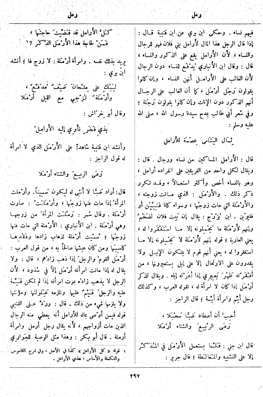 فِيهِمْ نِسَاءٌ. وَحَكَى ابْنُ بَرِّيٍّ عَنِ ابْنِ قُتَيْبَةَ قَالَ: إِذا قَالَ الرَّجُلُ هَذَا الْمَالُ لأَرَامِل بَنِي فُلَانٍ فَهُوَ لِلرِّجَالِ وَالنِّسَاءِ، لأَن الأَرَامِل يَقَعُ عَلَى الذُّكُورِ وَالنِّسَاءِ، قَالَ: وَقَالَ ابْنُ الأَنباري يُدْفَع لِلنِّسَاءِ دُونَ الرِّجَالِ لأَن الْغَالِبَ عَلَى الأَرَامِل أَنهن النِّسَاءُ، وإِن كَانُوا يَقُولُونَ رَجُل أَرْمَل، كَمَا أَن الْغَالِبَ عَلَى الرِّجَالِ أَنهم الذُّكُورُ دُونَ الإِناث وإِن كَانُوا يَقُولُونَ رَجُلة؛ وَفِي شِعْرِ أَبي طَالِبٍ يَمْدَحُ سَيِّدَنَا رَسُولَ اللَّهِ صَلَّى اللَّهُ عَلَيْهِ وَسَلَّمَ:
