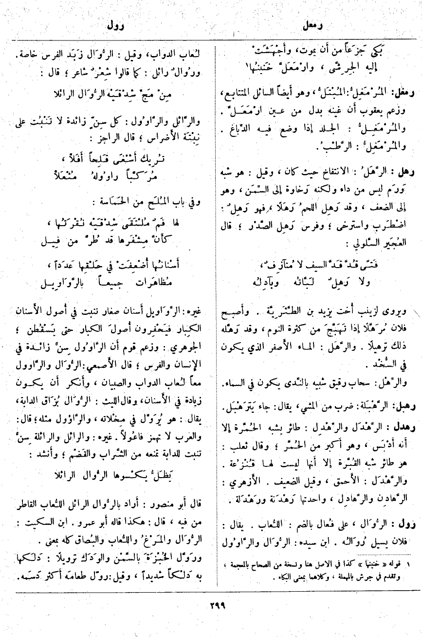 قَالَ أَبو مَنْصُورٍ: أَراد بالرُّوَال الرَّائِل اللُّعاب الْقَاطِرَ مِنْ فِيهِ، قَالَ: هَكَذَا قَالَهُ أَبو عَمْرٍو. ابْنُ السِّكِّيتِ: الرُّوَال والمَرْغُ واللُّعاب والبُصاق كُلُّهُ بِمَعْنًى. ورَوَّلَ الخُبْزَةَ بالسَّمْن والوَدَك تَرْوِيلًا: دَلَكها بِهِ دَلْكاً شَدِيدًا، وَقِيلَ: رَوَّلَ طعامَه أَكثر دَسَمه.
