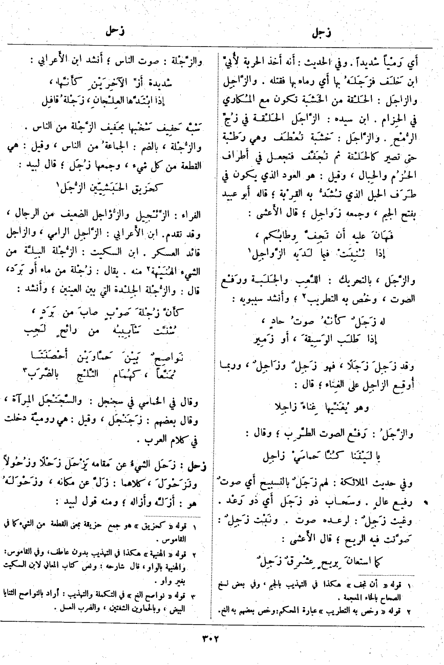 . الْفَرَّاءُ: الزِّئْجِيل والزُّؤاجل الضَّعِيفُ مِنَ الرِّجَالِ، وَقَدْ تَقَدَّمَ. ابْنُ الأَعرابي: الزَّاجِل الرَّامِي، والزَّاجِل قَائِدُ الْعَسْكَرِ. ابْنُ السِّكِّيتِ: الزُّجْلَة البِلَّة من الشيء الهُنَيْهة «4» مِنْهُ. يُقَالُ: زُجْلَة مِنْ مَاءٍ أَو بَرَد، قَالَ: والزُّجْلَة الجِلْدة الَّتِي بَيْنَ الْعَيْنَيْنِ؛ وأَنشد: