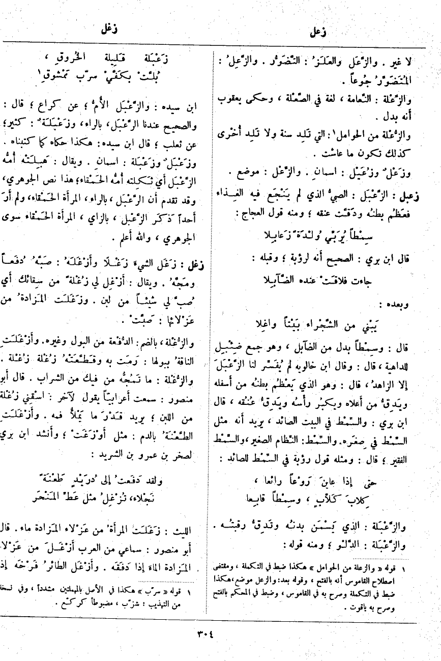 زعبل: الزَّعْبَل: الصبيُّ الَّذِي لَمْ يَنْجَع فِيهِ الغِذاء فعَظُم بطنُه ودَقَّت عُنُقُهُ؛ وَمِنْهُ قَوْلُ الْعَجَّاجِ: