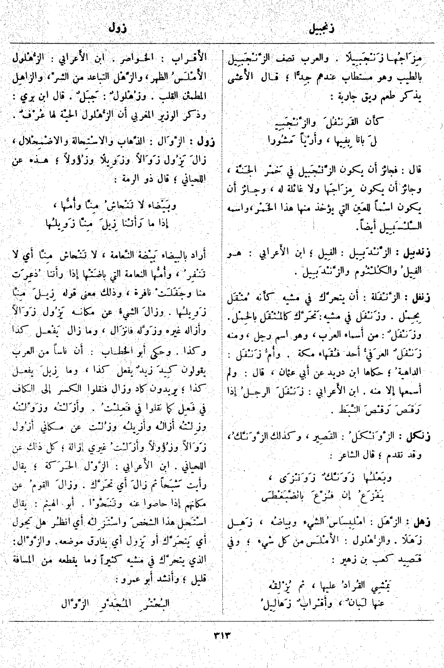 زهل: الزَّهَل: امْلِيسَاسُ الشَّيْءِ وبياضُه، زَهِل زَهَلًا. والزُّهْلُول: الأَمْلَس مِنْ كُلِّ شَيْءٍ؛ وَفِي قَصِيد كَعْبِ بْنِ زُهَيْرٍ: