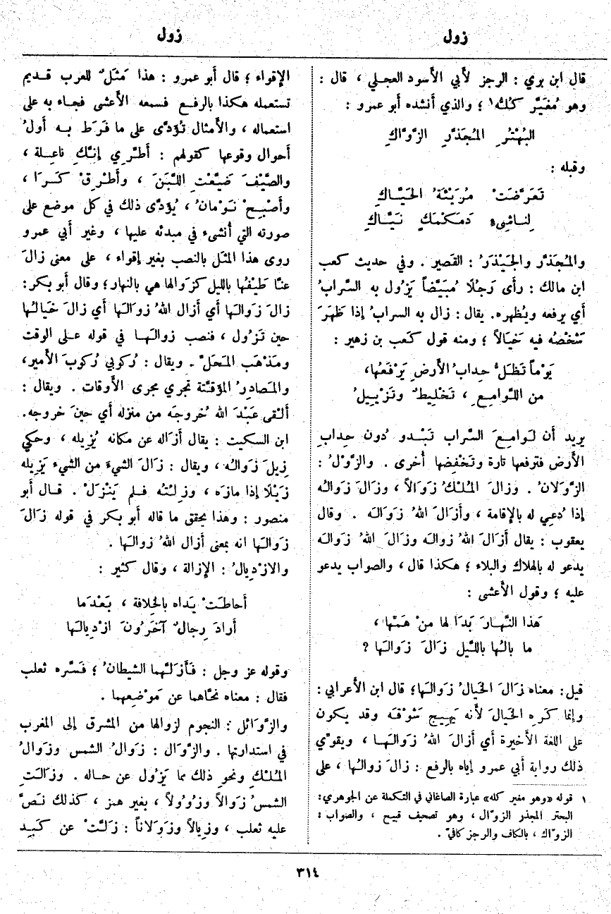 قِيلَ: مَعْنَاهُ زَالَ الخَيالُ زَوالَها؛ قَالَ ابْنُ الأَعرابي: وإِنما كَرِه الخيالَ لأَنه يَهِيج شَوْقَه وَقَدْ يَكُونُ عَلَى اللُّغَةِ الأَخيرة أَي أَزالَ اللهُ زَوالَها، ويقوِّي ذَلِكَ رِوَايَةُ أَبي عَمْرٍو إِياه بِالرَّفْعِ: زَالَ زَوَالُها، عَلَى الإِقواء؛ قَالَ أَبو عَمْرٍو: هَذَا مَثَلٌ لِلْعَرَبِ قَدِيمٌ تَسْتَعْمِلُهُ هَكَذَا بِالرَّفْعِ فَسَمِعَهُ الأَعشى فَجَاءَ بِهِ عَلَى اسْتِعْمَالِهِ، والأَمثال تُؤَدَّى عَلَى مَا فَرَط بِهِ أَولُ أَحوال وُقُوعِهَا كَقَوْلِهِمْ: أَطِّرِي إِنَّكِ ناعِلة، والصَّيْفَ ضَيَّعْتِ اللَّبَنَ، وأَطْرِقْ كَرَا، وأَصْبِحْ نَوْمانُ، يُؤَدَّى ذَلِكَ فِي كُلِّ مَوْضِعٍ عَلَى صُورَتِهِ الَّتِي أُنشئ فِي مَبْدَئِهِ عَلَيْهَا، وَغَيْرُ أَبي عَمْرٍو رَوَى هَذَا المثَل بِالنَّصْبِ بِغَيْرِ إِقواء، عَلَى مَعْنَى زَالَ عنَّا طَيْفُها بِاللَّيْلِ كزَوَالها هِيَ بِالنَّهَارِ؛ وَقَالَ أَبو بَكْرٍ: زَالَ زَوَالَها أَي أَزَالَ اللهُ زَوَالَها أَي زَالَ خَيالُها حِينَ تَزُول، فَنَصَبَ زوالَها فِي قَوْلِهِ عَلَى الْوَقْتِ ومَذْهَب المَحَلِّ. وَيُقَالُ: رُكوبي رُكوبَ الأَمير، والمَصادِرُ المؤَقَّتة تَجْرِي مَجْرَى الأَوقات. وَيُقَالُ: أَلْقى عَبْدَ اللَّهِ خُروجَه مِنْ مَنْزِلِهِ أَي حينَ خُرُوجِهِ. ابْنُ السِّكِّيتِ: يُقَالُ أَزَالَه عَنْ مَكَانِهِ يُزِيله، وَحُكِيَ زِيلَ زَوالُه، وَيُقَالُ: زَالَ الشيءَ مِنَ الشَّيْءِ يَزِيله زَيْلًا إِذا مازَه، وزِلْتُه فَلَمْ يَنْزَلْ. قَالَ أَبو مَنْصُورٍ: وَهَذَا يُحَقِّقُ مَا قَالَهُ أَبو بَكْرٍ فِي قَوْلِهِ زَالَ زَوَالَها أَنَّهُ بِمَعْنَى أَزَالَ اللهُ زَوَالَها. والازْدِيالُ: الإِزالة، وَقَالَ كُثَيِّرٌ: