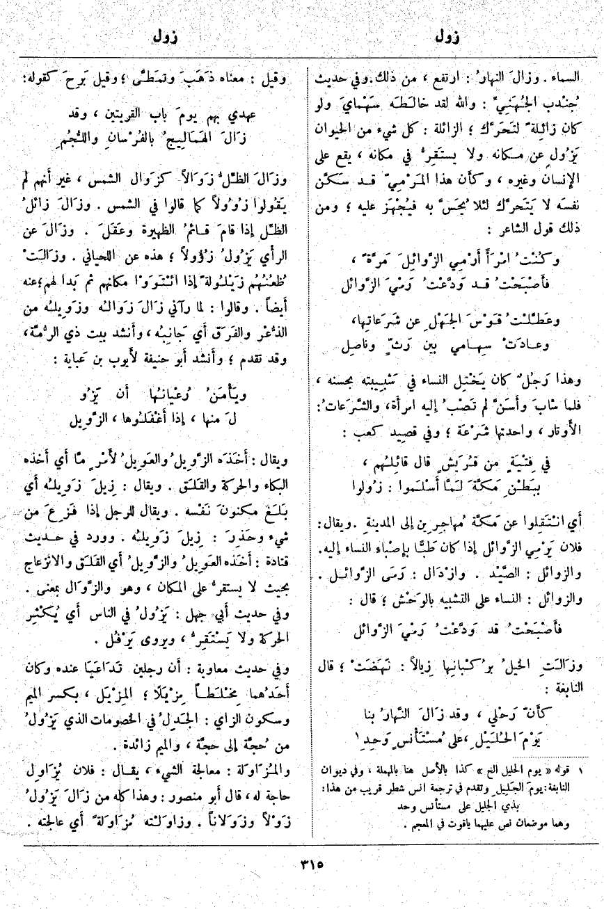 وزَالَ الظِّلُّ زَوَالًا كزَوال الشَّمْسِ، غَيْرَ أَنهم لَمْ يَقُولوا زُوُولًا كَمَا قَالُوا فِي الشَّمْسِ. وزَالَ زَائِلُ الظِّل إِذا قامَ قائمُ الظَّهِيرَةِ وعَقَلَ. وزَالَ عَنِ الرأْي يَزُولُ زُؤُولًا؛ هَذِهِ عَنِ اللِّحْيَانِيِّ. وزَالَتْ ظُعُنُهُم زَيْلُولةً إِذا ائْتَوَوْا مَكَانَهُمْ ثُمَّ بَدا لَهُمْ؛ عَنْهُ أَيضاً. وَقَالُوا: لَمَّا رَآنِي زَالَ زَوالُه وزَوِيلُه مِنَ الذُّعْر والفَرَق أَي جَانِبُه، وأَنشد بَيْتَ ذِي الرُّمَّة، وَقَدْ تَقَدَّمَ؛ وأَنشد أَبو حَنِيفَةَ لأَيوب بْنِ عَبابة: