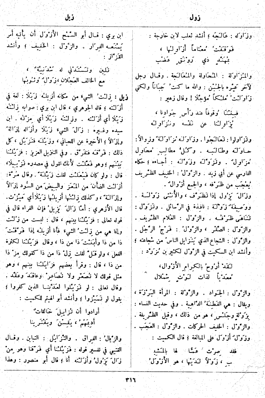 وتَزَاوَلُوا: تَعَالَجُوا. وزَاوَلَه مُزَاوَلَةً وزِوالًا: حاوَلَه وطَالَبه. وكُلُّ مطالِبٍ مُحَاوِل مُزَاوِلٌ. وتَزَوَّلَه وزَوَّلَه: أَجاءه؛ حَكَاهُ الْفَارِسِيُّ عَنْ أَبي زَيْدٍ. والزَّوْلُ: الخفِيف الظَّرِيف يُعْجَب مِنْ ظَرْفه، وَالْجَمْعُ أَزْوَالٌ. وزَالَ يَزُول إِذا تَظَرَّف، والأُنْثى زَوْلَة. ووَصِيفَةٌ زَوْلَة: نافِذة فِي الرَّسائل. وتَزَوَّلَ: تَنَاهَى ظَرْفُه. والزَّوْل: الغُلام الظَّريف. والزّوْل: الصَّقْر، والزَّوْلُ: فَرْجُ الرَّجُل. والزَّوْل: الشُّجَاعُ الَّذِي يَتَزايل الناسُ مِنْ شَجَاعَتِهِ؛ وأَنشد ابْنُ السِّكِّيتِ فِي الزَّوْل لِكَثِيرِ بْنِ مُزَرِّد: