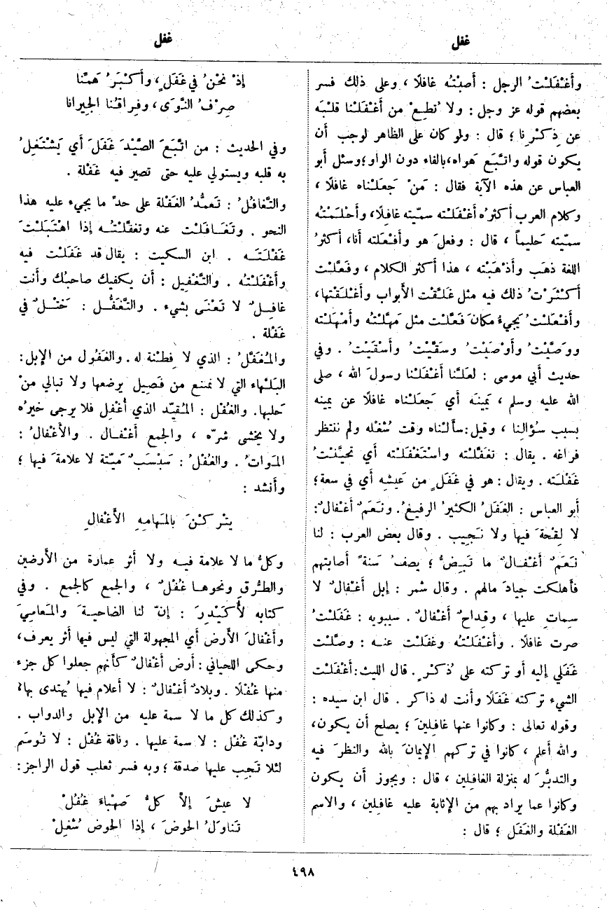 أَي جَعَلْناه غَافِلًا عَنْ يَمِينِهِ بِسَبَبِ سُؤَالِنا، وَقِيلَ: سأَلْناه وَقْتَ شُغْله وَلَمْ نَنْتَظِرْ فَرَاغَهُ. يُقَالُ: تغَفَّلْته واسْتَغْفَلْته أَي تحيَّنْتُ غَفْلَته. وَيُقَالُ: هُوَ فِي غَفَلٍ مِنْ عَيشِه أَي فِي سَعَةٍ؛ أَبو الْعَبَّاسِ: الغَفَلُ الكثيرُ الرفيعُ. ونَعَمٌ أَغْفَالٌ: لَا لِقْحةَ فِيهَا وَلَا نَجِيب. وَقَالَ بَعْضُ الْعَرَبِ: لَنَا نَعَمٌ أَغْفَالٌ مَا تَبِضُّ؛ يصفُ سَنةً أَصابتهم فأَهلكت جيادَ مَالِهِمْ. وَقَالَ شَمِرٌ: إِبل أَغْفَالٌ لا سِماتِ عليها، وقِداحٌ أَغْفَالٌ. سِيبَوَيْهِ: غَفَلْتُ صِرْتُ غَافِلًا. وأَغْفَلْتُه وغَفَلْت عَنْهُ: وصَّلْت غَفَلي إِليه أَو تَرَكْتُهُ عَلَى ذُكْرٍ. قَالَ اللَّيْثُ: أَغْفَلْت الشَّيْءَ تَرَكْتَهُ غَفَلًا وأَنت لَهُ ذَاكِرٌ. قَالَ ابْنُ سِيدَهْ: وَقَوْلُهُ تَعَالَى: وَكانُوا عَنْها غافِلِينَ*