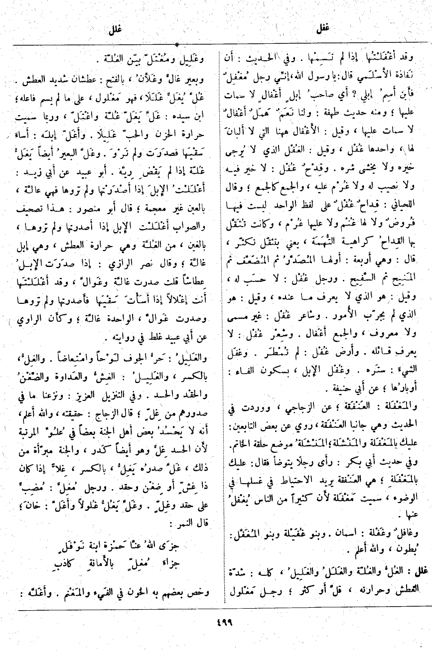غلل: الغُلُّ والغُلّة والغَلَلُ والغَلِيلُ، كُلُّهُ: شِدَّةُ الْعَطَشِ وَحَرَارَتُهُ، قلَّ أَو كَثُرَ؛ رَجُلٌ مَغْلول وغَلِيل ومُغْتَلّ بَيِّنُ الغُلّة. وَبَعِيرٌ غالٌّ وغَلَّانُ، بِالْفَتْحِ: عَطْشَانُ شَدِيدُ الْعَطَشِ. غُلَّ يُغَلٌّ غَلَلًا، فَهُوَ مَغْلول، عَلَى مَا لَمْ يُسَمَّ فَاعِلُهُ؛ ابْنُ سِيدَهْ: غَلَّ يَغَلّ غُلّة واغْتَلّ، وَرُبَّمَا سُمِّيَتْ حَرَارَةُ الْحُزْنِ وَالْحُبِّ غَلِيلًا. وأَغَلّ إِبلَه: أَساءَ سَقْيَها فصدَرَت وَلَمْ تَرْوَ. وغَلَّ البعيرُ أَيضاً يَغَلُّ غُلّة إِذا لَمْ يَقْضِ رِيَّه. أَبو عُبَيْدٍ عَنْ أَبي زَيْدٍ: أَعْلَلْتُ الإِبلَ إِذا أَصْدَرْتها وَلَمْ تُرْوِهَا فَهِيَ عالَّة، بِالْعَيْنِ غَيْرِ مُعْجَمَةٍ؛ قَالَ أَبو مَنْصُورٍ: هَذَا تَصْحِيفٌ وَالصَّوَابُ أَغْلَلْت الإِبل إِذا أَصدرتها وَلَمْ تُرْوِهَا، بِالْغَيْنِ، مِنَ الغُلَّة وَهِيَ حَرَارَةُ الْعَطَشِ، وَهِيَ إِبل غالَّة؛ وَقَالَ نَصْرٌ الرَّازِيُّ: إِذا صدَرَت الإِبلُ عِطاشاً قُلْتَ صَدَرَتْ غالَّة وغَوالَّ، وَقَدْ أَغْلَلْتَها أَنت إِغْلالًا إِذا أَسَأْتَ سَقْيَها فأَصدرتها وَلَمْ تَرْوِهَا وَصَدَرَتْ غَوالَّ، الْوَاحِدَةُ غالَّة؛ وكأَن الرَّاوِيَ عَنْ أَبي عُبَيْدٍ غَلِطَ فِي رِوَايَتِهِ. والغَلِيلُ: حَرُّ الْجَوْفِ لَوْحاً وامْتِعاضاً. والغِلُّ، بِالْكَسْرِ، والغَلِيلُ: الغِشُّ والعَداوة والضِّغْنُ والحقْد وَالْحَسَدُ. وَفِي التَّنْزِيلِ الْعَزِيزِ: وَنَزَعْنا مَا فِي صُدُورِهِمْ مِنْ غِلٍّ*