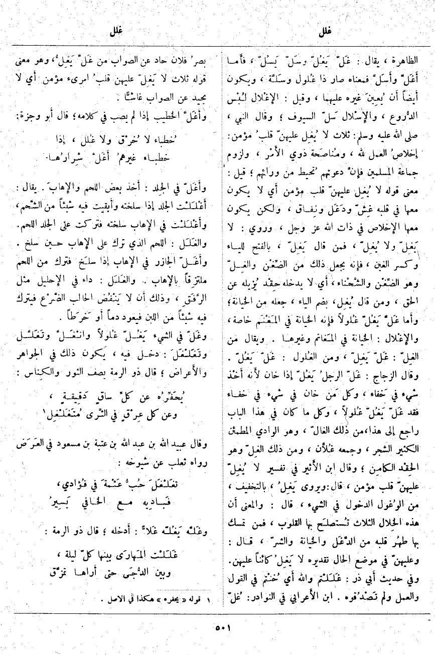 وأَغَلَّ فِي الجِلْد: أَخذ بَعْضَ اللَّحْمِ والإِهابَ. يُقَالُ: أَغْلَلْت الْجِلْدَ إِذا سَلَخْتَهُ وأَبقيت فِيهِ شَيْئًا مِنَ الشَّحم، وأَغْلَلْت فِي الإِهاب سَلَخْتَهُ فَتَرَكْتَ عَلَى الْجِلْدِ اللَّحْمَ. والغَلَل: اللَّحْمُ الَّذِي تُرِكَ عَلَى الإِهاب حِينَ سُلِخَ. وأَغَلَّ الْجَازِرُ فِي الإِهاب إِذا سلَخ فَتَرَكَ مِنَ اللَّحْمِ ملتزِقاً بالإِهاب. والغَلَل: دَاءٌ فِي الإِحليل مِثْلُ الرَّفَقِ، وَذَلِكَ أَن لَا يَنْفُض الْحَالِبُ الضَّرْع فَيَتْرُكَ فِيهِ شَيْئًا مِنَ اللَّبَنِ فَيَعُودُ دَمًا أَو خَرَطاً. وغَلَّ فِي الشَّيْءِ يَغُلُّ غُلولًا وانْغَلَّ وتَغَلَّلَ وتَغَلْغَلَ: دَخَلَ فِيهِ، يَكُونُ ذَلِكَ فِي الْجَوَاهِرِ والأَعراض؛ قَالَ ذُو الرُّمَّةِ يَصِفُ الثَّوْرَ والكِناس: