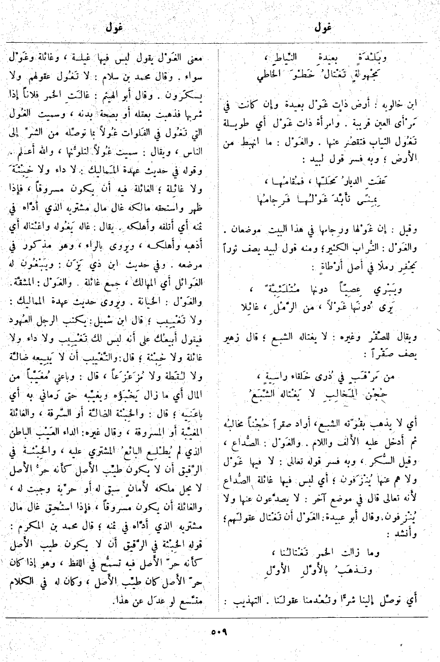 أَي توصِّل إِلينا شَرَّا وتُعْدمنا عقولَنا. التَّهْذِيبُ: مَعْنَى الغَوْل يَقُولُ لَيْسَ فِيهَا غِيلَةٌ، وَغَائِلَةٌ وغَوْل سَوَاءٌ. وَقَالَ مُحَمَّدُ بْنُ سَلَّامٍ: لَا تَغُول عُقُولُهُمْ وَلَا يسكَرون. وَقَالَ أَبو الْهَيْثَمِ: غَالَتِ الْخَمْرُ فُلَانًا إِذا شَرِبَهَا فَذَهَبَتْ بِعَقْلِهِ أَو بِصِحَّةِ بَدَنِهِ، وَسُمِّيَتِ الغُول الَّتِي تَغُول فِي الفَلوات غُولًا بِمَا توصِّله مِنَ الشرِّ إِلى النَّاسِ، وَيُقَالُ: سُمِّيَتْ غُولًا لتلوُّنها، وَاللَّهُ أَعلم. وَقَوْلُهُ فِي حَدِيثِ عُهْدَةِ المَماليك: