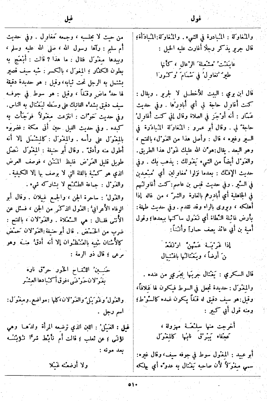 والمِغْوَل: كالمِشْمَل إِلا أَنه أَطول مِنْهُ وأَدقّ. وَقَالَ أَبو حَنِيفَةَ: المِغْوَل نَصْل طَوِيلٌ قَلِيلُ العَرْض غَلِيظُ المَتْن، فَوَصَفَ الْعَرْضَ الَّذِي هُوَ كمِّية بِالْقِلَّةِ الَّتِي لَا يُوصَفُ بِهَا إِلا الْكَيْفِيَّةُ. والغَوْل: جَمَاعَةُ الطَّلْح لَا يُشَارِكُهُ شَيْءٌ. والغُولُ: سَاحِرَةُ الْجِنِّ، وَالْجَمْعُ غِيلان. وَقَالَ أَبو الْوَفَاءِ الأَعرابيُّ: الغُول الذكَر مِنَ الْجِنِّ، فَسُئِلَ عَنِ الأُنثى فَقَالَ: هِيَ السِّعْلاة. والغَوْلان، بِالْفَتْحِ: ضَرْبٌ مِنَ الحَمْض. قَالَ أَبو حَنِيفَةَ: الغَوْلان حَمْض كالأُشنان شَبِيهٌ بالعُنْظُوان إِلا أَنه أَدقُّ مِنْهُ وَهُوَ مَرْعًى؛ قَالَ ذُو الرُّمَّةِ: