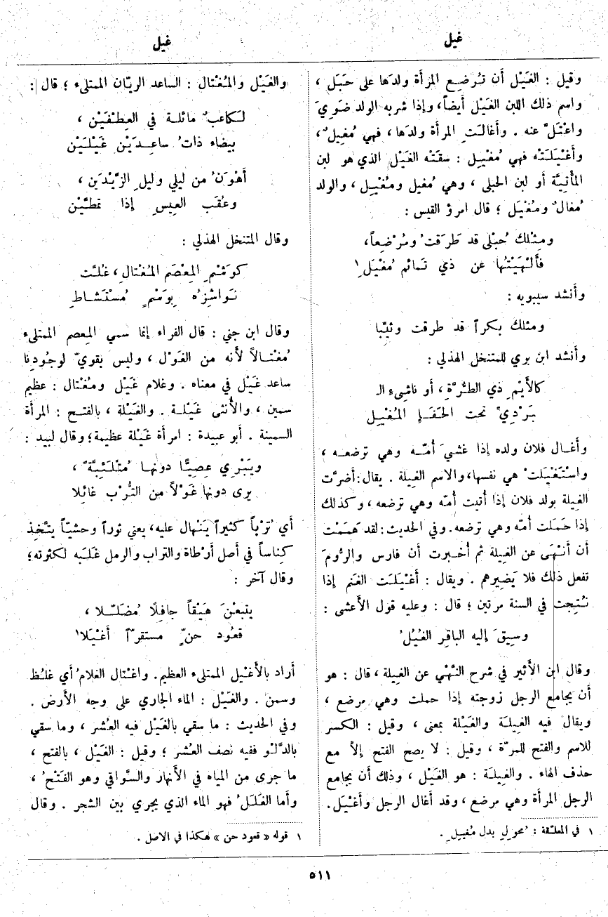 وَقَالَ ابْنُ الأَثير فِي شَرْحِ النَّهْي عَنِ الغِيلَة، قَالَ: هُوَ أَن يُجَامِعَ الرَّجُلُ زَوْجَتَهُ إِذا حَمَلَتْ وَهِيَ مُرْضِعٌ، وَيُقَالُ فِيهِ الغِيلَة والغَيْلة بِمَعْنًى، وَقِيلَ: الْكَسْرُ لِلِاسْمِ وَالْفَتْحُ لِلْمَرَّةِ، وَقِيلَ: لَا يَصِحُّ الْفَتْحُ إِلَّا مَعَ حَذْفِ الْهَاءِ. والغِيلَة: هُوَ الغَيْل، وَذَلِكَ أَن يُجَامِعَ الرَّجُلُ المرأَة وَهِيَ مُرْضِعٌ، وَقَدْ أَغَالَ الرَّجُلُ وأَغْيَل. والغَيْل والمُغْتال: السَّاعِدُ الرَّيَّانُ الْمُمْتَلِئُ؛ قَالَ: