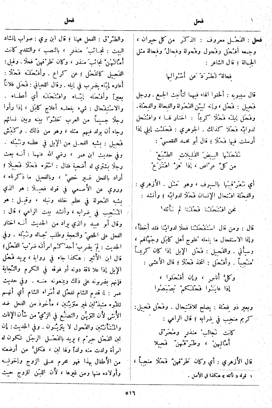 فحل: الفَحْل مَعْرُوفٌ: الذكَر مِنْ كُلِّ حَيَوَانٍ، وَجَمْعُهُ أَفْحُل وفُحول وفُحولة وفِحالٌ وفِحالة مِثْلُ الجِمالة؛ قَالَ الشَّاعِرُ: