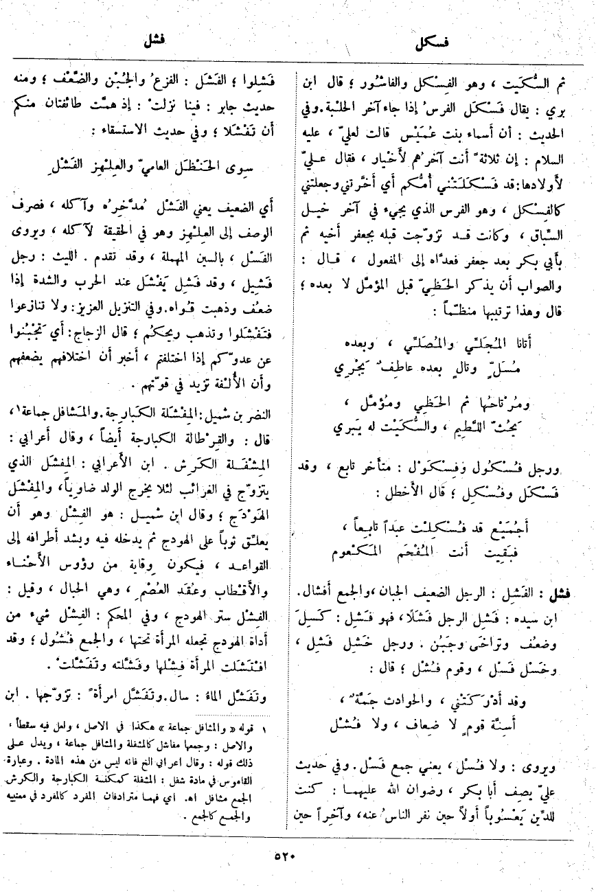 فشل: الفَشِل: الرَّجُلُ الضَّعِيفُ الْجَبَانُ، وَالْجَمْعُ أَفْشَال. ابْنُ سِيدَهْ: فَشِلَ الرَّجُلُ فَشَلًا، فَهُوَ فَشِلٌ: كَسِلَ وضعُف وتراخَى وجَبُن. وَرَجُلٌ خَشِل فَشِل، وخَسْل فَسْل، وَقَوْمٌ فُشْل؛ قَالَ: