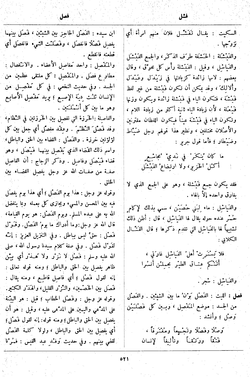 ؛ يُرِيدُ مَفْصِل الأَصابع وَهُوَ مَا بَيْنَ كُلِّ أَنْمُلَتين. والفاصِلة: الخَرزة الَّتِي تفصِل بَيْنَ الخَرزتين فِي النِّظام، وَقَدْ فَصَّلَ النَّظْمَ. وعِقْد مفصَّل أَي جُعِلَ بَيْنَ كُلِّ لُؤْلُؤَتَيْنِ خَرَزَةٌ. والفَصْل: الْقَضَاءُ بَيْنَ الْحَقِّ وَالْبَاطِلِ، وَاسْمُ ذَلِكَ القَضاء الَّذِي يَفْصِل بَيْنَهُمَا فَيْصَل، وَهُوَ قَضَاءٌ فَيْصَل وفَاصِل. وَذَكَرَ الزَّجَّاجُ: أَن الفَاصِل صِفَةٌ مِنْ صِفَاتِ اللَّهِ عَزَّ وَجَلَّ يفصِل الْقَضَاءِ بَيْنَ الْخَلْقِ. وَقَوْلُهُ عَزَّ وَجَلَّ: هَذَا يَوْمُ الْفَصْلِ