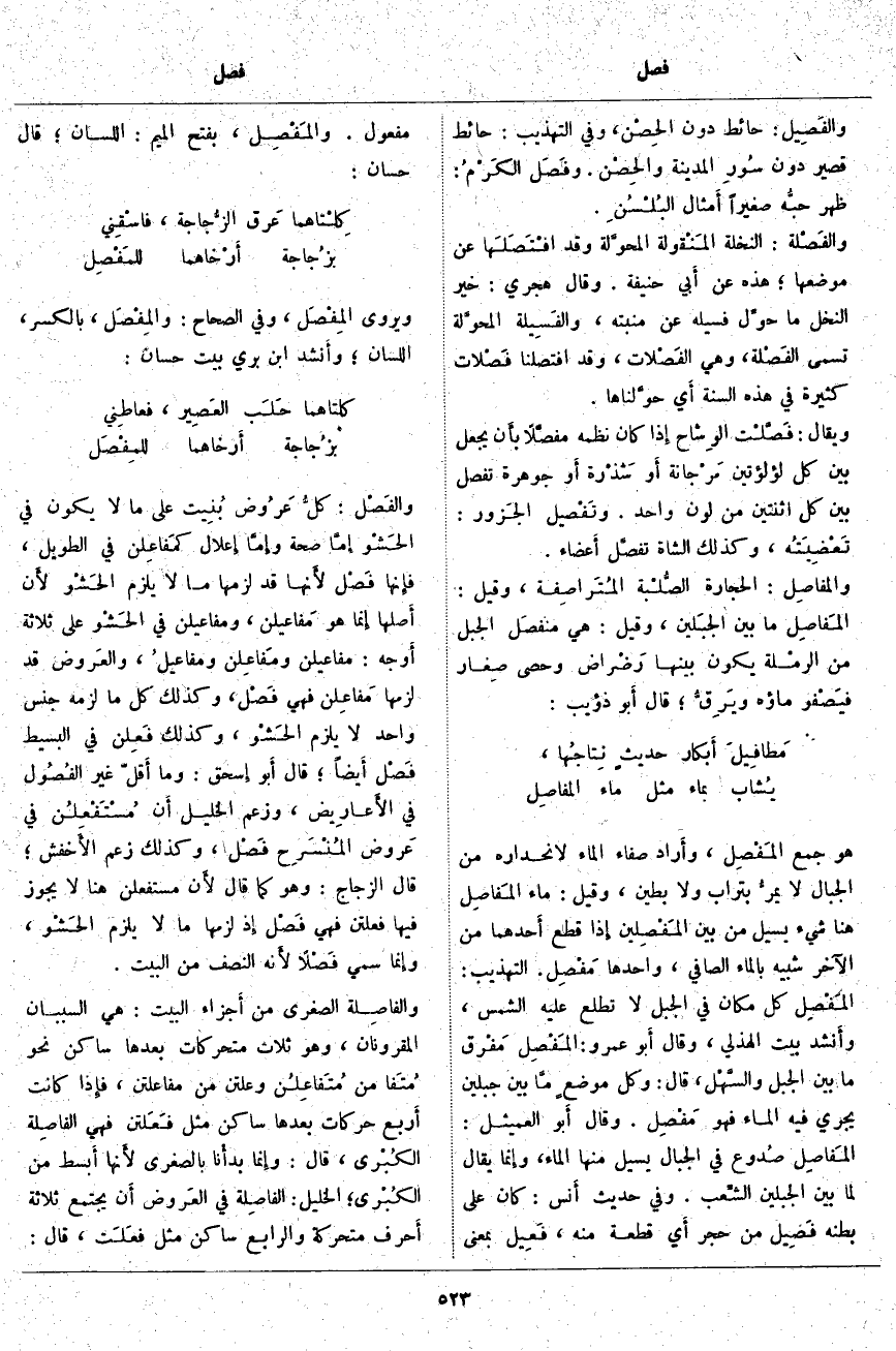 والفَصْل: كلُّ عَرُوض بُنِيت عَلَى مَا لَا يَكُونُ فِي الحَشْو إِمَّا صِحَّةٌ وإِمَّا إِعلال كمَفاعِلن فِي الطَّوِيلِ، فإِنها فَصْل لأَنها قَدْ لَزِمَهَا مَا لَا يَلْزَمُ الحَشْو لأَن أَصلها إِنما هُوَ مَفاعيلن، وَمَفَاعِيلُنْ فِي الحَشْو عَلَى ثَلَاثَةِ أَوجه: مَفَاعِيلُنْ ومَفاعِلن ومفاعيلُ، والعَروض قَدْ لَزِمَهَا مَفاعِلن فَهِيَ فَصْل، وَكَذَلِكَ كُلُّ مَا لَزِمَهُ جِنْسٌ وَاحِدٌ لَا يَلْزَمُ الحَشْو، وَكَذَلِكَ فَعِلن فِي الْبَسِيطِ فَصْل أَيضاً؛ قَالَ أَبو إِسحاق: وَمَا أَقلّ غَيْرَ الفُصُول فِي الأَعارِيض، وَزَعَمَ الْخَلِيلُ أَن مُسْتَفْعِلُن فِي عَروض المُنْسَرِح فَصْل، وَكَذَلِكَ زَعَمَ الأَخفش؛ قَالَ الزَّجَّاجُ: وَهُوَ كَمَا قَالَ لأَن مُسْتَفْعِلُنْ هُنَا لَا يَجُوزُ فِيهَا فَعَلَتُنْ فَهِيَ فَصْل إِذ لَزِمَهَا مَا لَا يَلْزَمُ الحَشْو، وإِنما سُمِّيَ فَصْلًا لأَنه النِّصْفُ مِنَ الْبَيْتِ. والفَاصِلة الصُّغْرَى مِنْ أَجزاء الْبَيْتِ: هِيَ السَّبَبَانِ الْمَقْرُونَانِ، وَهُوَ ثَلَاثُ مُتَحَرِّكَاتٍ بَعْدَهَا سَاكِنٌ نَحْوَ مُتَفا مِنْ مُتَفاعِلُن وَعَلَتُنْ مِنْ مُفَاعَلَتُنْ، فإِذا كَانَتْ أَربع حَرَكَاتٍ بَعْدَهَا سَاكِنٌ مِثْلُ فَعَلتن فَهِيَ الفاصِلة الكُبْرى، قَالَ: وإِنما بدأْنا بِالصُّغْرَى لأَنها أَبسط مِنَ الكُبْرى؛ الْخَلِيلُ: الفاصِلة فِي العَروض أَن يَجْتَمِعَ ثَلَاثَةُ أَحرف مُتَحَرِّكَةٍ وَالرَّابِعُ سَاكِنٌ مِثْلُ فَعَلَت، قَالَ: