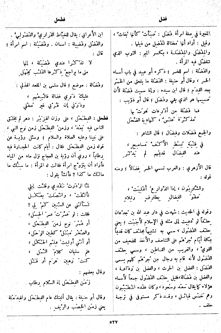 فطحل: الفِطَحْل، عَلَى وَزْنِ الهِزَبْر: دَهْرٌ لَمْ يخلَق النَّاسُ فِيهِ بَعْدُ، وزمنُ الفِطَحْل زَمَنُ نُوحٍ النَّبِيِّ، عَلَى نَبِيِّنَا وَعَلَيْهِ الصَّلَاةُ وَالسَّلَامُ؛ وَسُئِلَ رُؤْبَةُ عَنْ قَوْلِهِ زَمَنَ الفِطَحْل فَقَالَ: أَيام كَانَتِ الْحِجَارَةُ فِيهِ رِطاباً، رُوِيَ أَن رُؤْبَةَ بْنَ الْعَجَّاجِ نَزَلَ مَاءً مِنَ الْمِيَاهِ فأَراد أَن يتزوَّج امرأَة فَقَالَتْ لَهُ المرأَة: مَا سِنُّك مَا مالُك مَا كَذَا؟ فأَنشأَ يَقُولُ: