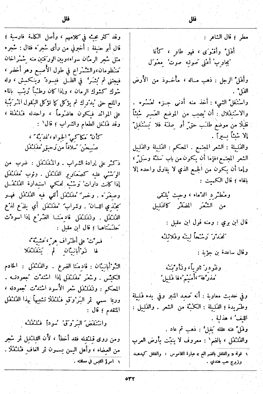 ؛ الفَلِيلة: الكُبَّة مِنَ الشَّعَرِ. والفَلِيل: الليفُ، هُذَلِيَّةٌ. وفَلَّ عَنْهُ عَقْلُهُ يَفِلُّ: ذَهَبَ ثُمَّ عَادَ. والفُلْفُل، بِالضَّمِّ «1»: مَعْرُوفٌ لَا ينبُت بأَرض الْعَرَبِ وَقَدْ كَثُرَ مَجِيئُهُ فِي كَلَامِهِمْ، وأَصل الْكَلِمَةِ فَارِسِيَّةٌ؛ قَالَ أَبو حَنِيفَةَ: أَخبرني مَنْ رأَى شجرَه فَقَالَ: شَجَرُهُ مِثْلُ شَجَرِ الرمَّان سَوَاءٌ، وَبَيْنَ الورَقتين مِنْهُ شِمْراخان مَنْظومان، والشِّمْراخ فِي طُولِ الأُصبع وَهُوَ أَخضر، فَيُجْتَنَى ثُمَّ يُشَرُّ فِي الظِّلِّ فَيَسْوَدُّ وينكمِش، وَلَهُ شَوْكٌ كَشَوْكِ الرُّمَّانِ، وإِذا كَانَ رطْباً رُبِّب بِالْمَاءِ وَالْمِلْحِ حَتَّى يُدْرِك ثُمَّ يُؤْكَلَ كَمَا تُؤْكَلُ البُقول المُرَبَّبة عَلَى الْمَوَائِدِ فَيَكُونُ هاضُوماً، وَاحِدَتُهُ فُلْفُلة، وَقَدْ فَلْفَلَ الطَّعَامَ وَالشَّرَابَ؛ قَالَ: «2».