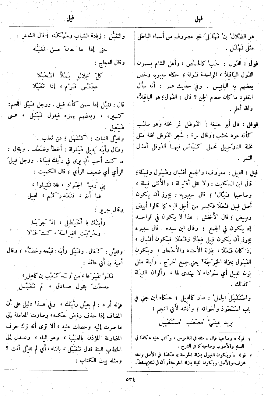 قَالَ: تَفَيَّل إِذا سَمِنَ كأَنه فِيل. وَرَجُلٌ فَيِّل اللَّحْمِ: كَثِيرُهُ، وَبَعْضُهُمْ يَهْمِزُهُ فَيَقُولُ فَيْئِل، عَلَى فَيْعِل. وتَفَيَّلَ النَّبَاتُ: اكْتَهَل؛ عَنْ ثَعْلَبٍ. وفَالَ رأْيُه يَفِيل فَيْلُولَة: أَخْطأَ وضَعُف. وَيُقَالُ: مَا كُنْتُ أُحب أَن يَرَى فِي رأْيك فِيَالة. وَرَجُلٌ فِيلُ الرأْي أَي ضَعِيفُ الرأْي؛ قَالَ الْكُمَيْتُ: