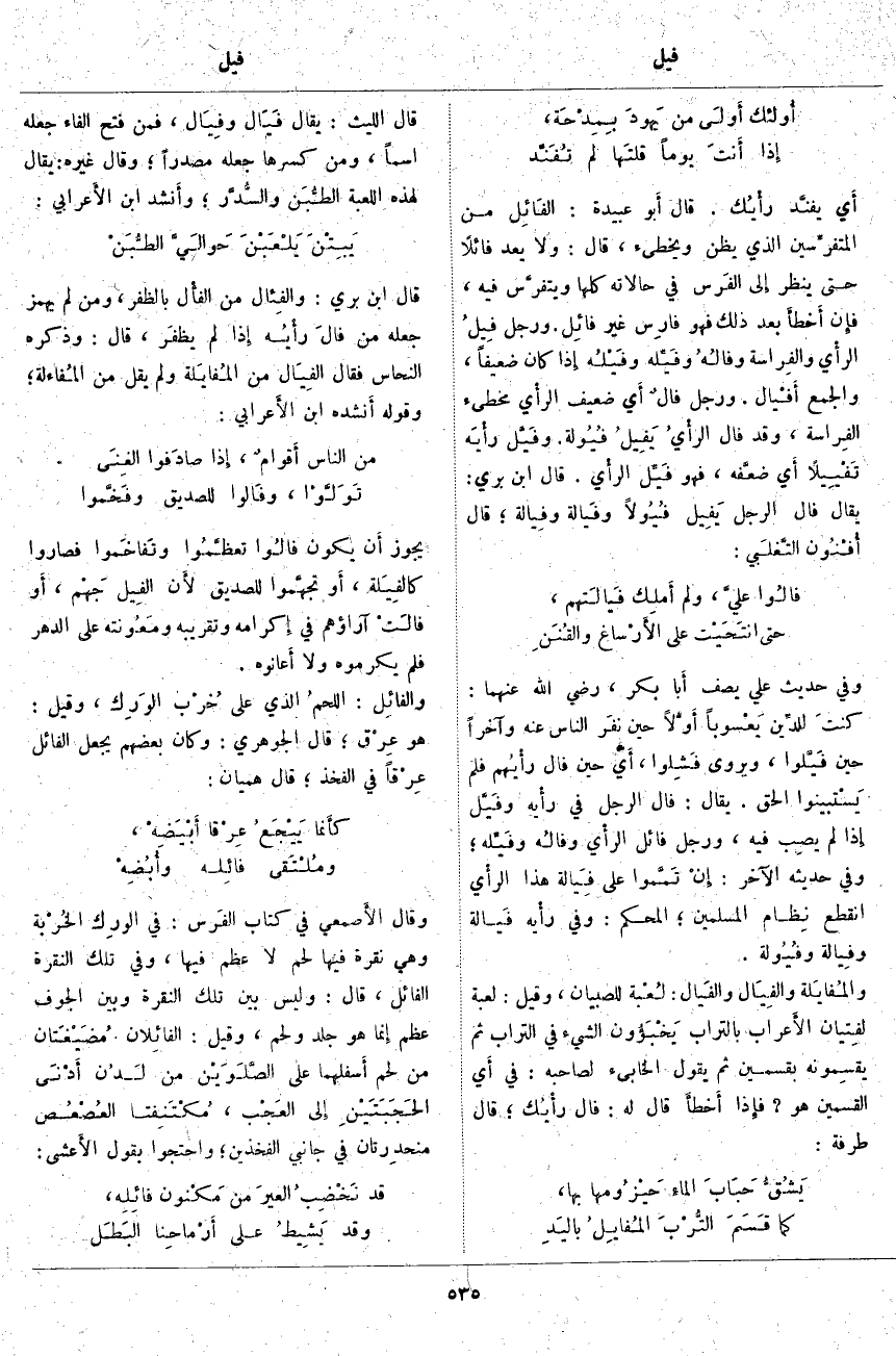 أَي يفنَّد رأْيُك. قَالَ أَبو عُبَيْدَةَ: الفَائِل مِنَ المتفرِّسين الذي يظن ويخطىء، قَالَ: وَلَا يُعَدَّ فَائِلًا حَتَّى يُنْظَرَ إِلى الفَرس فِي حَالَاتِهِ كُلِّهَا ويتفرَّس فِيهِ، فإِن أَخطأَ بَعْدَ ذَلِكَ فَهُوَ فارِس غَيْرُ فَائِل. وَرَجُلٌ فِيلُ الرأْي والفِراسة وفالُهُ وفَيِّله وفَيْلُه إِذا كَانَ ضَعِيفًا، وَالْجَمْعُ أَفْيال. وَرَجُلٌ فالٌ أَي ضَعِيفُ الرأْي مُخْطِئُ الفِراسة، وَقَدْ فَالَ الرأْيُ يَفِيلُ فُيُولة. وفَيَّلَ رأْيَه تَفْيِيلًا أَي ضعَّفه، فَهُوَ فَيِّلُ الرأْي. قَالَ ابْنُ بَرِّيٍّ: يُقَالُ فَالَ الرَّجُلُ يَفِيل فُيُولًا وفَيالة وفِيالة؛ قَالَ أُفْنُون التَّغلَبي:
