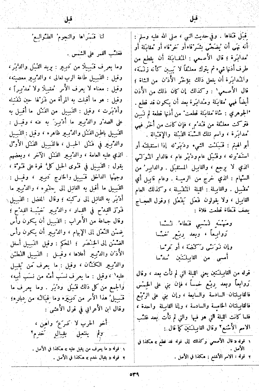 ، قَالَ الأَصمعي: المُقابَلة أَن يُقْطَعَ مِنْ طَرَفِ أُذنها شَيْءٌ ثُمَّ يَتْرُكُ معلَّقاً لَا يَبِين كأَنه زنَمَة، والمُدابَرة أَن يَفْعَلَ ذَلِكَ بمؤَخَّر الأُذُن مِنَ الشَّاةِ، قَالَ الأَصمعي: «1» وَكَذَلِكَ إِن كَانَ ذَلِكَ مِنَ الأُذن أَيضاً فَهِيَ مُقابَلة ومُدابَرة بَعْدَ أَن يَكُونَ قَدْ قُطِعَ. الْجَوْهَرِيُّ: شَاةٌ مُقابَلة قطعتْ مِنْ أُذنها قِطْعَةٌ لَمْ تَبِن فَتُرِكَتْ معلَّقة مِنْ قُدُمٍ، فإِن كَانَتْ مِنْ أُخُر فَهِيَ مُدابَرة، وَاسْمُ تِلْكَ السِّمَة القُبْلة والإِقْبَالة. أَبو الْهَيْثَمِ: قَبَلْت الشَّيْءَ ودَبَرْته إِذا استقبلتَه أَو استَدْبرته، وقُبْل عَامٍ ودُبْر عَامٍ، فَالدَّابِرُ المُوَلّي الَّذِي لَا يَرْجِعُ، والقابِل المستقبَل. والدابِرُ مِنَ السِّهام: الَّذِي خَرَجَ مِنَ الرَّمِيَّةِ. وَعَامٌ قابِل أَي مُقْبِل. والقَابِلة: اللَّيْلَةُ المُقْبِلة، وَكَذَلِكَ الْعَامُ القَابِل، وَلَا يَقُولُونَ فَعَل يَفْعُل، وَقَوْلُ الْعَجَّاجِ يَصِفُ قَطاة قَطَعَتْ فَلَاةً: