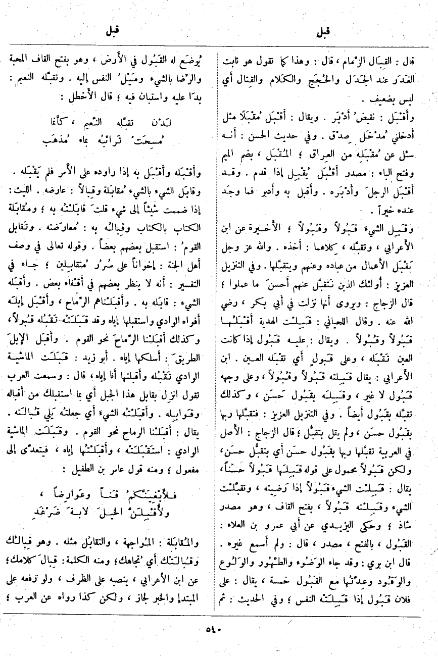 وأَقْبَله وأَقْبَلَ بِهِ إِذا رَاوَدَهُ عَلَى الأَمر فَلَمْ يَقْبَله. وقَابَلَ الشَّيْءَ بِالشَّيْءِ مُقَابَلةً وقِبالًا: عَارَضَهُ. اللَّيْثُ: إِذا ضَمَمْتَ شَيْئًا إِلى شَيْءٍ قلتَ قابَلْتُه بِهِ، ومُقابَلة الْكَتَابِ بِالْكَتَابِ وقِبالُه بِهِ: مُعارَضته. وتَقَابَلَ القومُ: اسْتَقْبَلَ بَعْضُهُمْ بَعْضًا. وَقَوْلُهُ تَعَالَى فِي وَصْفِ أَهل الْجَنَّةِ: إِخْواناً عَلى سُرُرٍ مُتَقابِلِينَ