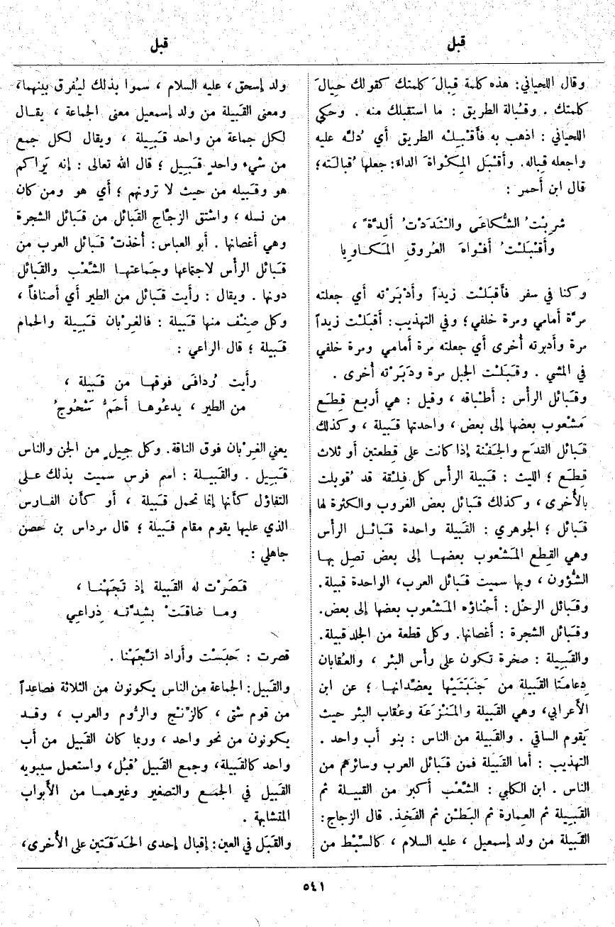 وَكُنَا فِي سَفَرٍ فأَقبَلْت زَيْدًا وأَدْبَرْته أَي جَعَلْتُهُ مرَّة أَمامي وَمَرَّةً خَلْفِي، وَفِي التَّهْذِيبِ: أَقْبَلْت زَيْدًا مَرَّةً وأَدبرته أُخرى أَي جَعَلْتُهُ مَرَّةً أَمامي وَمَرَّةً خَلْفِي فِي الْمَشْيِ. وقَبَلْت الْجَبَلَ مَرَّةً ودَبَرْته أُخرى. وقَبَائِل الرأْس: أَطْباقه، وَقِيلَ: هِيَ أَربع قِطَع مَشْعوب بَعْضُهَا إِلَى بَعْضٍ، وَاحِدَتُهُا قَبيلة، وَكَذَلِكَ قَبائل القدَح والجَفْنة إِذا كَانَتْ عَلَى قِطعتين أَو ثَلَاثِ قِطَع، اللَّيْثُ: قَبيلة الرأْس كُلُّ فِلقة قَدْ قُوبلت بالأُخرى، وَكَذَلِكَ قَبائل بَعْضِ الْغُرُوبِ وَالْكَثْرَةِ لَهَا قَبائل، الْجَوْهَرِيُّ: القَبيلة وَاحِدَةُ قَبائل الرأْس وَهِيَ القِطع المَشْعوب بَعْضُهَا إِلَى بَعْضٍ تصِل بها الشُّؤون، وَبِهَا سُمِّيَتْ قَبائل الْعَرَبِ، الْوَاحِدَةُ قَبِيلَةٌ. وقَبائل الرحْل: أَحْناؤه المَشْعوب بَعْضُهَا إِلى بَعْضٍ. وقَبائل الشَّجَرَةِ: أَغصانها. وَكُلُّ قِطْعَةٍ مِنَ الْجِلْدِ قَبِيلَةٌ. والقَبِيلة: صَخْرَةٌ تَكُونَ عَلَى رأْس الْبِئْرِ، والعُقابان دِعامَتا القَبيلة مِنْ جَنَبَتَيْها يعضِّدانها، عَنِ ابْنِ الأَعرابي، وَهِيَ القَبيلة والمَنْزَعَة وعُقاب الْبِئْرِ حَيْثُ يَقوم السَّاقِي. والقَبيلة مِنَ النَّاسِ: بَنُو أَب وَاحِدٍ. التَّهْذِيبِ: أَمَّا الْقَبِيلَةُ فَمِنْ قَبائل الْعَرَبِ وَسَائِرُهُمْ مِنَ النَّاسِ. ابْنُ الْكَلْبِيِّ: الشَّعْب أَكبر مِنَ القَبِيلة ثُمَّ الْقَبِيلَةُ ثُمَّ العِمارة ثُمَّ البَطْن ثُمَّ الفَخِذ. قَالَ الزَّجَّاجُ: القَبيلة مِنْ وَلَدِ إِسماعيل، عَلَيْهِ السَّلَامُ، كالسِّبْط مِنْ وَلَدِ إِسحاق، عَلَيْهِ السَّلَامُ، سُمُّوا بِذَلِكَ ليُفرق بَيْنَهُمَا، وَمَعْنَى القَبيلة من ولد إِسماعيل مَعْنَى الْجَمَاعَةِ، يُقَالُ لِكُلِّ جَمَاعَةٍ مِنْ وَاحِدٍ قَبِيلة، وَيُقَالُ لِكُلِّ جَمْعٍ مِنْ شَيْءٍ واحدٍ قَبِيل، قَالَ اللَّه تَعَالَى: إِنَّهُ يَراكُمْ هُوَ وَقَبِيلُهُ مِنْ حَيْثُ لَا تَرَوْنَهُمْ