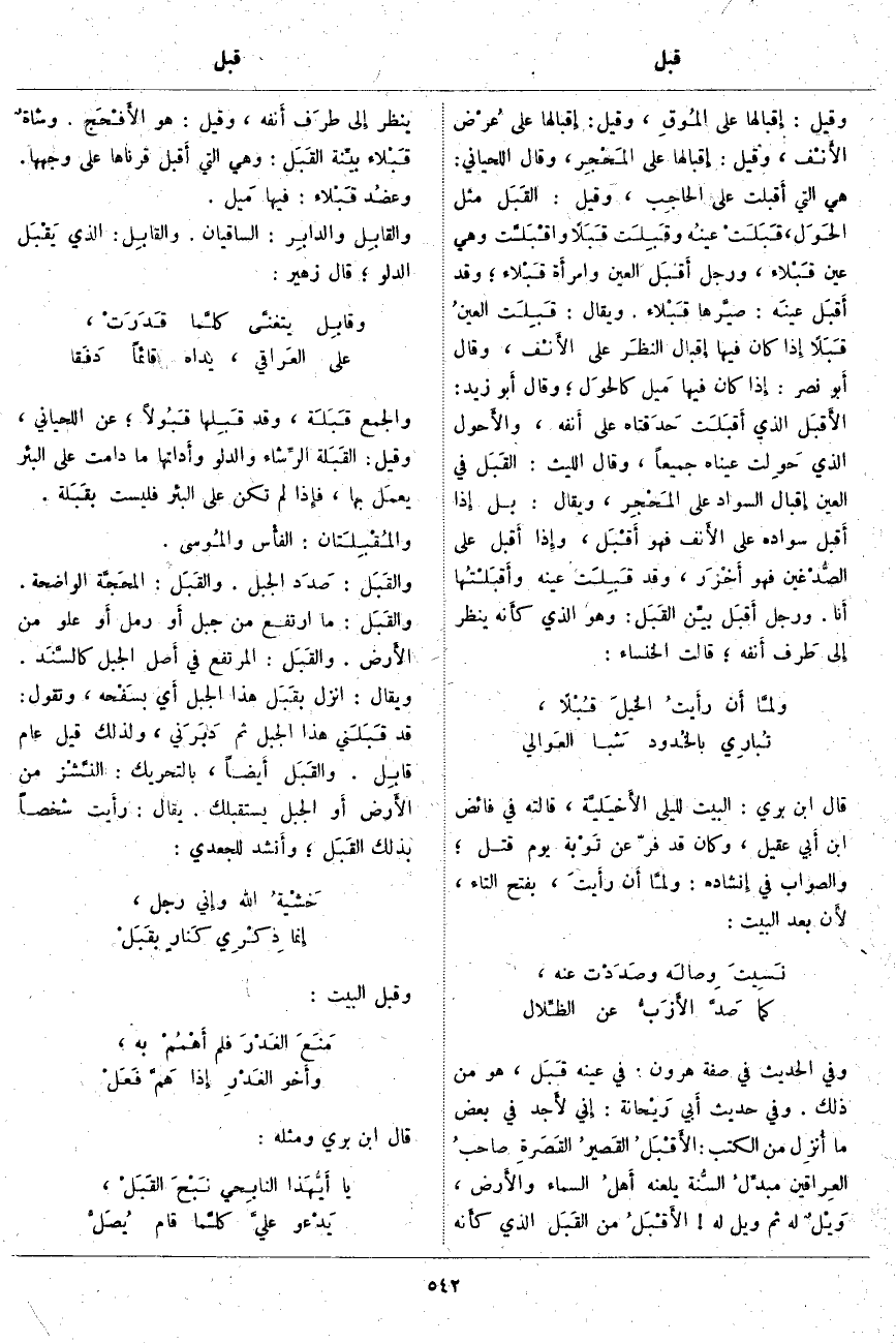 ، هُوَ مِنْ ذَلِكَ. وَفِي أَبي رَيْحانة: إِني لأَجد فِي بَعْضِ مَا أُنزِل مِنَ الْكُتُبِ: الأَقْبَلُ القَصيرُ القَصَرةِ صاحبُ العِراقين مبدِّلُ السُّنة يَلْعَنُهُ أَهلُ السَّمَاءِ والأَرض، وَيْلٌ لَهُ ثُمَّ وَيْلٌ لَهُ! الأَقْبَلُ مِنَ القَبَل الَّذِي كأَنه يَنْظُرُ إِلى طرَف أَنفه، وَقِيلَ: هُوَ الأَفْحَج. وَشَاةٌ قَبْلاء بيِّنة القَبَل: وَهِيَ الَّتِي أَقبل قَرْنَاهَا عَلَى وَجْهِهَا. وعضُد قَبْلاء: فِيهَا مَيل. والقَابِل والدابِر: السَّاقِيَانِ. والقابِل: الَّذِي يَقْبَل الدَّلْوَ، قَالَ زُهَيْرٌ: