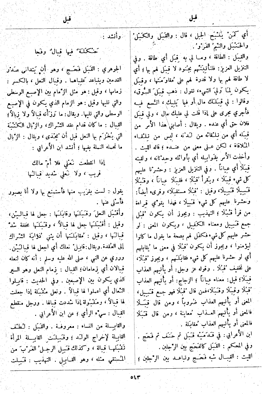 ، أَيْ لَا طَاقَةَ لَهُمْ بِهَا وَلَا قُدْرَةَ لَهُمْ عَلَى مُقاوَمَتها، وقِبَل يَكُونُ لِمَا وَليَ الشَّيْءَ، تَقُولُ: ذَهَبَ قِبَلَ السُّوق، وَقَالُوا: لِي قِبَلَك مَالٌ أَو فِيمَا يَلِيك، اتُّسع فِيهِ فأُجري مُجْرَى عَلَى إِذا قُلْتَ لِي عَلَيْكَ مَالٌ، وَلِي قِبَل فُلَانٍ حَقٌّ أَي عِنْدَهُ. وَيُقَالُ: أَصابني هَذَا الأَمر مِنْ قِبَله أَي مِنْ تِلْقائه مِنْ لَدُنه، لَيْسَ مِنْ تِلْقاء المُلاقاة، لَكِنْ عَلَى مَعْنَى مِنْ عِنْدِهِ، قَالَهُ اللَّيْثُ. وأَخذت الأَمر بقَوابِله أَي بأَوائله وحِدْثانه، وَلَقِيتُهُ قِبَلًا أَي عِياناً. وَفِي التَّنْزِيلِ الْعَزِيزِ: وَحَشَرْنا عَلَيْهِمْ كُلَّ شَيْءٍ قُبُلًا