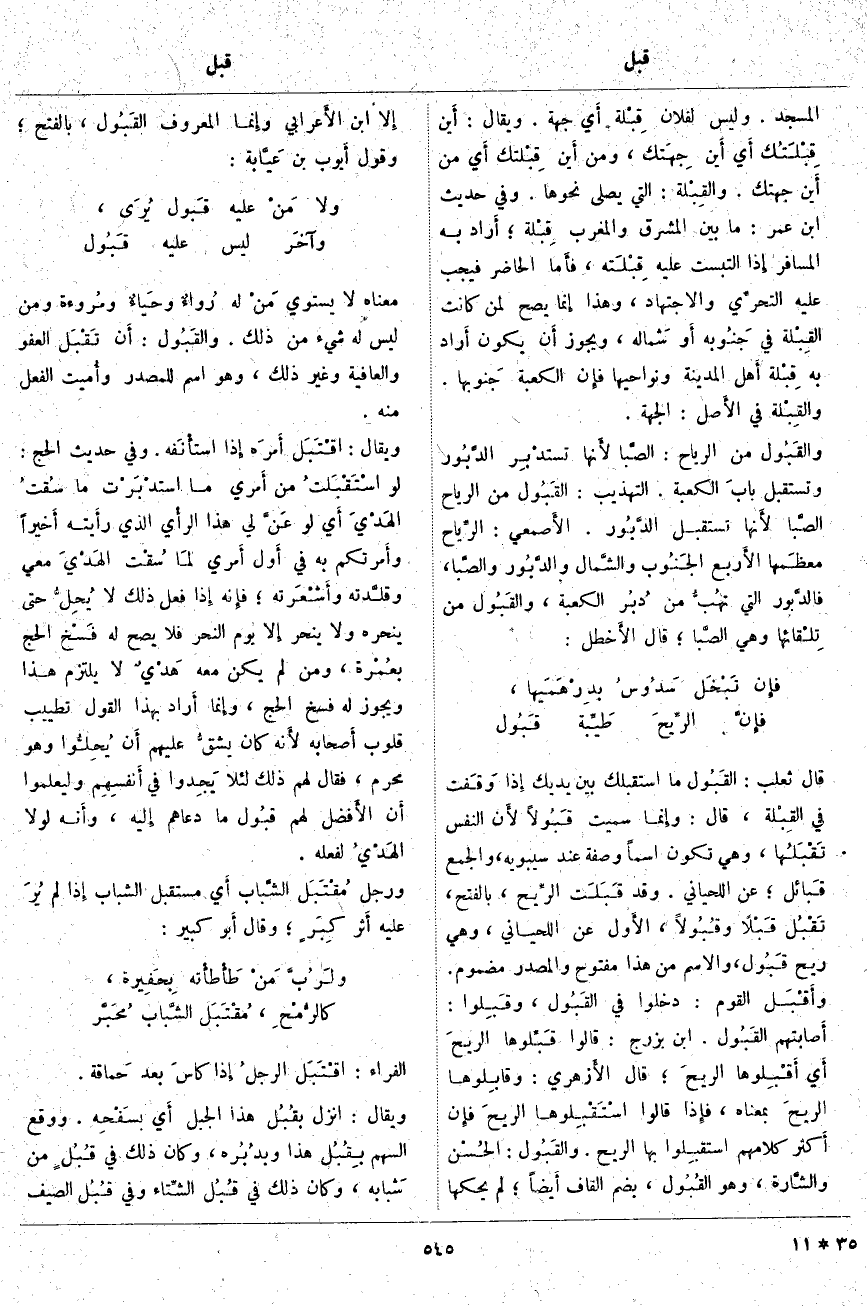 ، أَراد بِهِ الْمُسَافِرَ إِذا الْتُبِسَتْ عَلَيْهِ قِبْلَته، فأَما الْحَاضِرُ فِيجِبُ عَلَيْهِ التحرِّي وَالِاجْتِهَادُ، وَهَذَا إِنما يَصِحُّ لِمَنْ كَانَتِ القِبْلة فِي جَنُوبه أَو شَماله، وَيَجُوزُ أَن يَكُونَ أَراد بِهِ قِبْلة أَهل الْمَدِينَةِ وَنَوَاحِيَهَا فإِن الْكَعْبَةَ جَنوبها. والقِبْلة فِي الأَصل: الْجِهَةُ. والقَبُول مِنَ الرِّيَاحِ: الصَّبا لأَنها تستدْبِر الدَّبُور وَتَسْتَقْبِلُ بابَ الْكَعْبَةِ. التَّهْذِيبِ: القَبُول مِنَ الرِّيَاحِ الصَّبا لأَنها تَسْتَقْبِلُ الدَّبُور. الأَصمعي: الرِّياح معظَمها الأَربع الجَنُوب والشَّمال والدَّبُور والصَّبا، فالدَّبور الَّتِي تهُبُّ مِنْ دُبُر الْكَعْبَةِ، والقَبُول مِنْ تِلْقائها وَهِيَ الصَّبا، قَالَ الأَخطل: