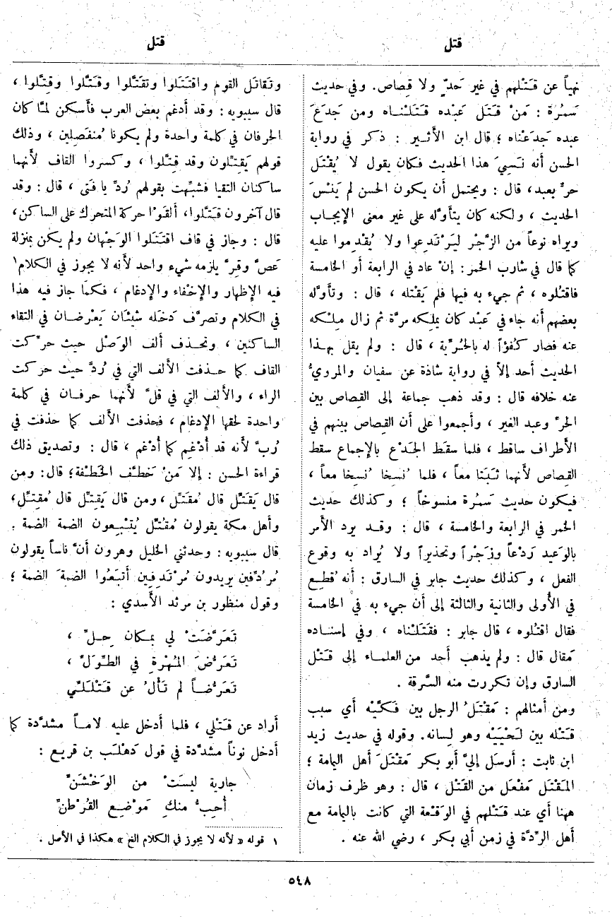 ؛ المَقْتَل مَفْعَل مِنَ القَتْل، قَالَ: وَهُوَ ظَرْفُ زَمَانٍ هَاهُنَا أَي عِنْدَ قَتْلهم فِي الوَقْعة الَّتِي كَانَتْ بِالْيَمَامَةِ مَعَ أَهل الرِّدَّة فِي زَمَنِ أَبي بَكْرٍ، رَضِيَ اللَّهُ عَنْهُ. وتَقَاتَلَ الْقَوْمُ واقتَتَلُوا وتَقَتَّلوا وقَتَّلوا وقِتَّلوا، قَالَ سِيبَوَيْهِ: وَقَدْ أَدغم بَعْضُ الْعَرَبِ فأَسكن لمَّا كَانَ الْحَرْفَانِ فِي كَلِمَةٍ وَاحِدَةٍ وَلَمْ يَكُونَا مُنفَصِلين، وَذَلِكَ قَوْلُهُمْ يَقِتِّلون وَقَدْ قِتَّلوا، وَكَسَرُوا الْقَافَ لأَنهما سَاكِنَانِ الْتَقَيَا فشبِّهت بِقَوْلِهِمْ رُدِّ يَا فَتى، قَالَ: وَقَدْ قَالَ آخَرُونَ قَتَّلوا، أَلقَوْا حَرَكَةَ الْمُتَحَرِّكِ عَلَى السَّاكِنِ، قَالَ: وَجَازَ فِي قَافِ اقْتَتَلوا الوَجْهان ولم يكن بمنزلة عَصَّ وقِرَّ يَلْزَمُهُ شَيْءٌ وَاحِدٌ لأَنه لَا يَجُوزُ فِي الْكَلَامِ «7» فِيهِ الإِظهار والإِخْفاء والإِدغام، فَكَمَا جَازَ فِيهِ هَذَا فِي الْكَلَامِ وتصرَّف دَخَله شيئَان يَعْرضان فِي الْتِقَاءِ السَّاكِنَيْنِ، وَتُحْذَفُ أَلف الوَصْل حَيْثُ حرِّكت الْقَافُ كَمَا حُذِفَتِ الأَلف الَّتِي فِي رُدَّ حَيْثُ حُرِّكَتِ الرَّاءُ، والأَلف الَّتِي فِي قلَّ لأَنهما حَرْفَانِ فِي كَلِمَةٍ وَاحِدَةٍ لَحِقَهَا الإِدغام، فَحُذِفَتِ الأَلف كَمَا حُذِفَتْ فِي رُبَّ لأَنه قَدْ أُدْغِم كَمَا أُدْغم، قَالَ: وَتَصْدِيقُ ذَلِكَ قِرَاءَةُ