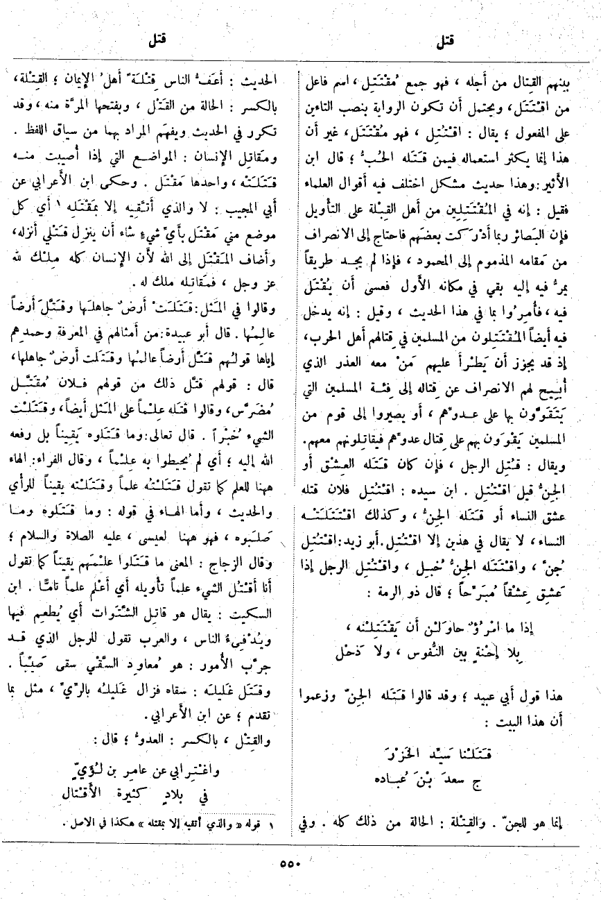 بَيْنَهُمُ القِتال مِنْ أَجله، فَهُوَ جَمْعُ مُقْتَتِل، اسْمُ فَاعِلٍ مِنَ اقْتَتَلَ، وَيُحْتَمَلُ أَن تَكُونَ الرِّوَايَةُ بِنَصْبِ التَّاءَيْنِ عَلَى الْمَفْعُولِ؛ يُقَالُ: اقْتُتِلَ، فَهُوَ مُقْتَتَل، غَيْرَ أَن هَذَا إِنما يَكْثُرُ اسْتِعْمَالُهُ فِيمَنْ قَتَله الحُبُّ؛ قَالَ ابْنُ الأَثير: وَهَذَا حَدِيثٌ مُشْكِلٌ اخْتَلَفَ فِيهِ أَقوال الْعِلْمَاءِ فَقِيلَ: إِنه فِي المُقْتَتِلِين مِنْ أَهل القِبْلة عَلَى التأْويل فإِن البَصائر رُبَّمَا أَدْرَكت بعضَهم فَاحْتَاجَ إِلى الِانْصِرَافِ مِنْ مَقامه الْمَذْمُومِ إِلى الْمَحْمُودِ، فإِذا لَمْ يَجِدْ طَرِيقًا يمرُّ فِيهِ إِليه بَقِيَ فِي مَكَانِهِ الأَول فَعَسَى أَن يُقْتَل فِيهِ، فأُمِرُوا بِمَا فِي هَذَا الْحَدِيثِ، وَقِيلَ: إِنه يَدْخُلُ فِيهِ أَيضاً المُقْتَتِلون مِنَ الْمُسْلِمِينَ فِي قِتالهم أَهل الْحَرْبِ، إِذ قَدْ يَجُوزُ أَن يَطْرأَ عَلَيْهِمْ مَنْ مَعَهُ الْعُذْرُ الَّذِي أُبِيح لَهُمُ الِانْصِرَافُ عَنْ قِتاله إِلى فِئة الْمُسْلِمِينَ الَّتِي يَتَقَوَّون بِهَا عَلَى عدوِّهم، أَو يَصِيرُوا إِلى قَوْمٍ مِنَ الْمُسْلِمِينَ يَقْوَون بِهِمْ عَلَى قِتال عدوِّهم فيقاتِلونهم مَعَهُمْ. وَيُقَالُ: قُتِلَ الرَّجُلُ، فإِن كَانَ قَتَله العِشْق أَو الجِنُّ قِيلَ اقْتُتِل. ابْنُ سِيدَهْ: اقْتُتِل فُلَانٌ قَتَلَهُ عَشِقُ النِّسَاءَ أَو قَتَله الجِنُّ، وَكَذَلِكَ اقْتَتَلَتْه النِّسَاءُ، لَا يُقَالُ فِي هَذَيْنِ إِلا اقْتُتِلَ. أَبو زَيْدٍ: اقْتُتِلَ جُنَّ، واقْتَتَلَه الجِنُّ خُبِل، واقْتُتِلَ الرَّجُلُ إِذا عَشِق عِشْقاً مُبَرِّحاً؛ قَالَ ذُو الرُّمَّةِ:
