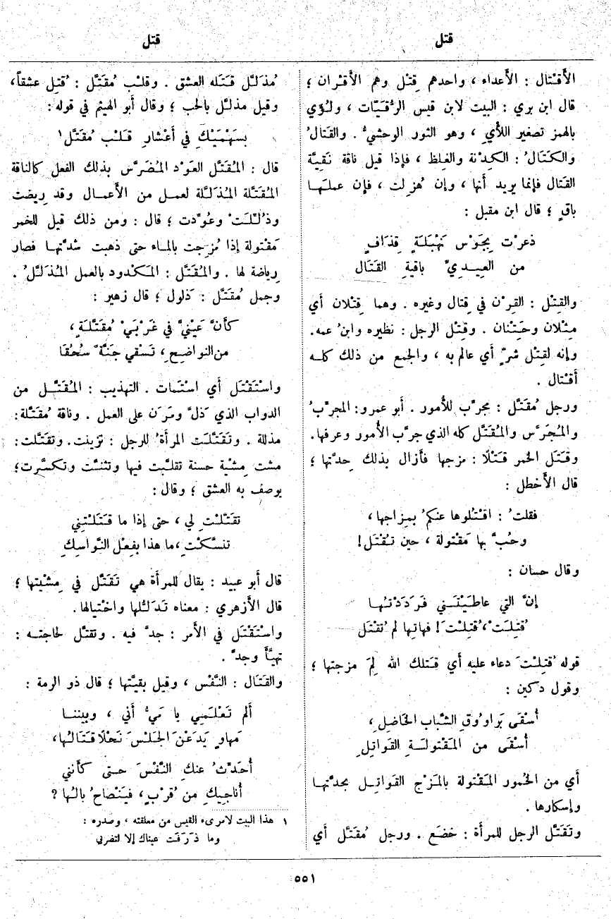 أَي مِنَ الخُمور المَقْتولة بالمَزْج القَواتِل بحدَّتها وإِسكارها. وتَقَتَّل الرَّجُلُ للمرأَة: خضَع. وَرَجُلٌ مُقَتَّل أَي مُذَلَّل قَتَله الْعِشْقُ. وقلْب مُقَتَّل: قُتِل عِشْقًا، وَقِيلَ مذلَّل بِالْحُبِّ؛ وَقَالَ أَبو الْهَيْثَمِ فِي قَوْلِهِ: