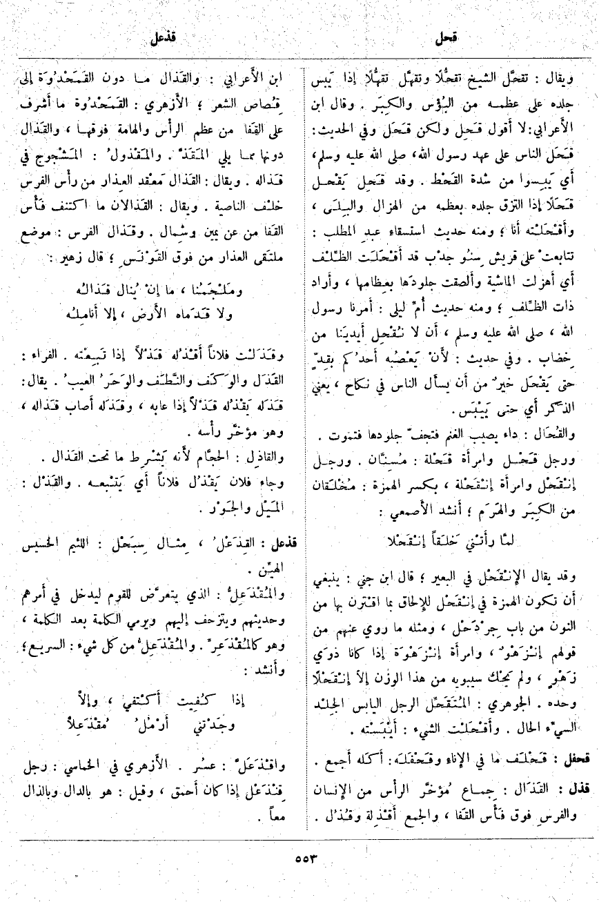 قذعل: القِذَعْلُ، مِثال سِبَحْل: اللَّئِيمُ الْخَسِيسُ الهيِّن. والمُقْذَعِلُّ: الَّذِي يتعرَّض لِلْقَوْمِ لِيَدْخُلَ فِي أَمرهم وَحَدِيثِهِمْ وَيَتَزَحَّفُ إِليهم وَيَرْمِي الْكَلِمَةَ بَعْدَ الْكَلِمَةِ، وَهُوَ كالمُقْذَعِرِّ. والمُقْذَعِلُّ مِنْ كُلِّ شَيْءٍ: السَّرِيعُ؛ وأَنشد: