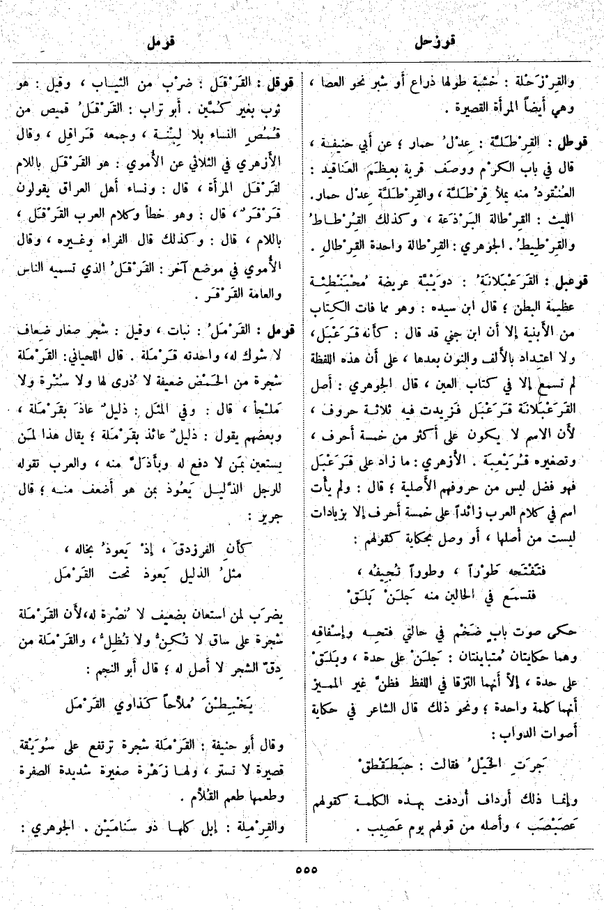 قرمل: القَرْمَلُ: نَبَاتٌ، وَقِيلَ: شَجَرٌ صِغَارٌ ضِعاف لَا شَوْكَ لَهُ، وَاحِدَتُهُ قَرْمَلة. قَالَ اللِّحْيَانِيُّ: القَرْمَلة شَجَرَةٌ مِنَ الحَمْض ضَعِيفَةٌ لَا ذُرى لَهَا وَلَا سُتْرة وَلَا مَلْجأ، قَالَ: وَفِي المثَل: ذليلٌ عاذَ بقَرْمَلة، وَبَعْضُهُمْ يَقُولُ: ذليلٌ عَائِذٌ بقَرْمَلة؛ يُقَالُ هَذَا لمَن يَسْتَعِينُ بمَن لَا دَفْعَ لَهُ وبأَذَلَّ مِنْهُ، وَالْعَرَبُ تَقُولُهُ لِلرَّجُلِ الذَّليل يَعُوذ بِمَنْ هُوَ أَضعف مِنْهُ؛ قَالَ جَرِيرٌ:
