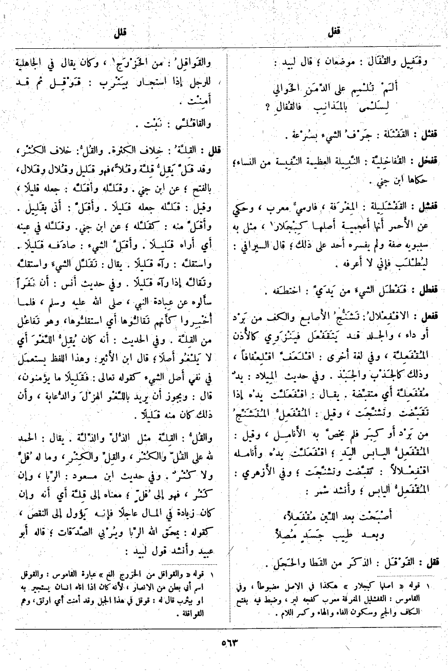 قفشل: القَفْشَلِيلَة: المِغْرَفة، فارسيٌّ مُعَرَّبٌ، وَحُكِيَ عَنِ الأَحمر أَنها أَعجمية أَصلها كِبْجَلار «2»، مَثَّلَ بِهِ سِيبَوَيْهِ صِفَةً وَلَمْ يُفَسِّرْهُ أَحد عَلَى ذَلِكَ؛ قَالَ السِّيرَافِيُّ: ليُطْلَب فإِني لا أَعرفه.
