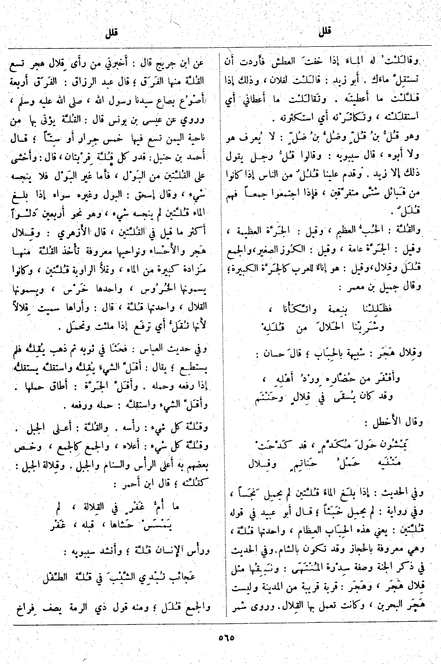 وقَالَلْتُ لَهُ الماءَ إِذا خفتَ الْعَطَشَ فأَردت أَن تستقِلَّ ماءَك. أَبو زَيْدٍ: قالَلْت لِفُلَانٍ، وَذَلِكَ إِذا قلَّلْت مَا أَعطيتَه. وتَقالَلْت مَا أَعطاني أَي استقلَلْته، وتكاثَرْته أَي اسْتَكْثَرْتُهُ. وَهُوَ قُلُّ بنُ قُلٍّ وضُلُّ بنُ ضُلٍّ: لَا يُعرف هُوَ وَلَا أَبوه، قَالَ سِيبَوَيْهِ: وَقَالُوا قُلُّ رَجُلٍ يَقُولُ ذَلِكَ إِلا زَيْدٌ. وَقَدِمَ عَلَيْنَا قُلُلٌ مِنَ النَّاسِ إِذا كَانُوا مِنْ قَبائل شتَّى متفرِّقين، فإِذا اجْتَمَعُوا جَمْعًا فَهُمْ قُلَلٌ. والقُلَّة: الحُبُّ الْعَظِيمُ، وَقِيلَ: الجَرَّة الْعَظِيمَةُ، وَقِيلَ: الجَرَّة عَامَّةً، وَقِيلَ: الكُوز الصَّغِيرُ، وَالْجَمْعُ قُلَل وقِلال، وَقِيلَ: هُوَ إِناءٌ لِلْعَرَبِ كالجَرَّة الْكَبِيرَةِ؛ وَقَالَ جَمِيلُ بْنُ مَعْمَرٍ: