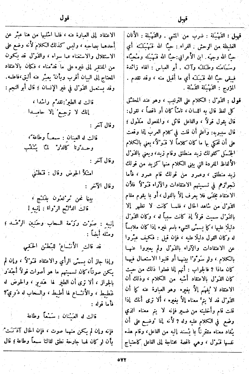 قول: القَوْل: الْكَلَامُ عَلَى التَّرْتِيبِ، وَهُوَ عِنْدَ المحقِّق كُلُّ لَفْظٍ قَالَ بِهِ اللِّسَانُ، تَامًّا كَانَ أَو نَاقِصًا، تَقُولُ: قَالَ يَقُولُ قَولًا، وَالْفَاعِلُ قَائِل، وَالْمَفْعُولُ مَقُول؛ قَالَ سِيبَوَيْهِ: وَاعْلَمْ أَن قُلْتَ فِي كَلَامِ الْعَرَبِ إِنما وَقَعَتْ عَلَى أَن تَحْكِي بِهَا مَا كَانَ كَلَامًا لَا قَوْلًا، يَعْنِي بِالْكَلَامِ الجُمَل كَقَوْلِكَ زَيْدٌ مُنْطَلِقٌ وَقَامَ زَيْدٌ، وَيَعْنِي بالقَوْل الأَلفاظ الْمُفْرَدَةَ الَّتِي يُبْنَى الْكَلَامُ مِنْهَا كَزَيْدٍ مِنْ قَوْلِكَ زَيْدٌ مُنْطَلِقٌ، وَعَمْرٌو مِنْ قَوْلِكَ قَامَ عَمْرٌو، فأَما تَجوُّزهم فِي تَسْمِيَتِهِمْ الِاعْتِقَادَاتِ وَالْآرَاءَ قَوْلًا فلأَن الِاعْتِقَادَ يخفَى فَلَا يُعْرَفُ إِلَّا بِالْقَوْلِ، أَو بِمَا يَقُومُ مَقَامَ القَوْل مِنْ شَاهِدِ الْحَالِ، فَلَمَّا كَانَتْ لَا تَظْهَرُ إِلا بالقَوْل سُمِّيَتْ قَوْلًا إِذ كَانَتْ سَبَبًا لَهُ، وَكَانَ القَوْل دَلِيلًا عَلَيْهَا، كَمَا يسمَّى الشَّيْءَ بِاسْمِ غَيْرِهِ إِذا كَانَ مُلَابِسًا لَهُ وَكَانَ الْقَوْلُ دَلِيلًا عَلَيْهِ، فإِن قِيلَ: فَكَيْفَ عبَّروا عَنِ الِاعْتِقَادَاتِ وَالْآرَاءِ بالقَوْل وَلَمْ يُعَبِّرُوا عَنْهَا بِالْكَلَامِ، وَلَوْ سَوَّوْا بَيْنَهُمَا أَو قَلَبُوا الِاسْتِعْمَالَ فِيهِمَا كَانَ مَاذَا؟ فَالْجَوَابُ: أَنهم إِنما فَعَلُوا ذَلِكَ مِنْ حَيْثُ كَانَ القَوْل بِالِاعْتِقَادِ أَشبه مِنَ الْكَلَامِ، وَذَلِكَ أَنَّ الِاعْتِقَادَ لَا يُفْهَم إِلَّا بِغَيْرِهِ وَهُوَ الْعِبَارَةُ عَنْهُ كَمَا أَن القَوْل قَدْ لَا يتمُّ مَعْنَاهُ إِلَّا بِغَيْرِهِ، أَلا تَرَى أَنك إِذا قُلْتَ قَامَ وأَخليته مِنْ ضَمِيرٍ فإِنه لَا يَتِمُّ مَعْنَاهُ الَّذِي وُضِعَ فِي الْكَلَامِ عَلَيْهِ وَلَهُ؟ لأَنه إِنما وُضِع عَلَى أَن يُفاد مَعْنَاهُ مقترِناً بِمَا يُسْنَدُ إِليه مِنَ الْفَاعِلِ، وَقَامَ هَذِهِ نَفْسُهَا قَوْل، وَهِيَ نَاقِصَةٌ مُحْتَاجَةٌ إِلى الْفَاعِلِ كَاحْتِيَاجِ الِاعْتِقَادِ إِلى الْعِبَارَةِ عَنْهُ، فَلَمَّا اشْتَبَهَا مِنْ هُنَا عُبِّرَ عَنْ أَحدهما بِصَاحِبِهِ، وَلَيْسَ كَذَلِكَ الْكَلَامُ لأَنه وُضِعَ عَلَى الِاسْتِقْلَالِ وَالِاسْتِغْنَاءِ عَمَّا سِوَاهُ، والقَوْل قَدْ يَكُونُ مِنَ المفتقِر إِلى غَيْرِهِ عَلَى مَا قدَّمْناه، فَكَانَ بِالِاعْتِقَادِ الْمُحْتَاجِ إِلى الْبَيَانِ أَقرب وبأَنْ يعبَّر عَنْهُ أَليق، فَاعْلَمْهُ. وَقَدْ يُسْتَعْمَلُ القَوْل فِي غَيْرِ الإِنسان؛ قَالَ أَبو النَّجْمِ: