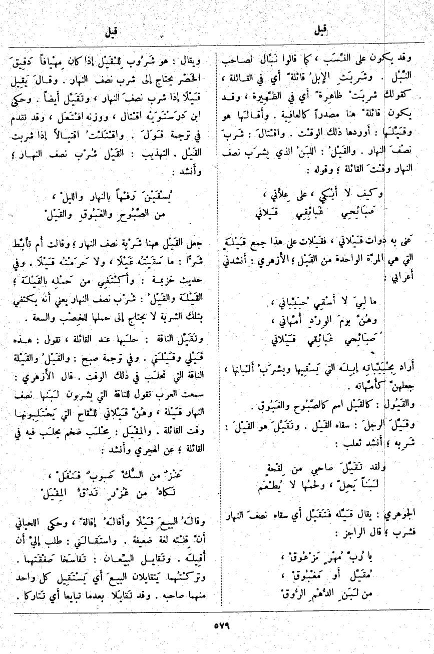 ، القَيْلَة والقَيْلُ: شُرْب نِصْفَ النَّهَارِ يَعْنِي أَنه يَكْتَفِي بِتِلْكَ الشَّرْبَةِ لَا يَحْتَاجُ إِلى حَمْلِهَا للخِصْب وَالسَّعَةِ. وتَقَيَّلَ النَّاقَةَ: حلَبها عِنْدَ الْقَائِلَةِ، تَقُولُ: هَذِهِ قَيْلي وقَيْلَتي. وَفِي تَرْجَمَةِ صبح: والقَيْلُ والقَيْلَة النَّاقَةُ الَّتِي تحلَب فِي ذَلِكَ الْوَقْتِ. قَالَ الأَزهري: سَمِعْتُ الْعَرَبَ تَقُولُ لِلنَّاقَةِ الَّتِي يَشْرَبُونَ لَبَنها نِصْفَ النَّهَارِ قَيْلة، وهُنَّ قَيْلاتي للِّقاح الَّتِي يَحْتَلِبونها وَقْتَ الْقَائِلَةِ. والمِقْيَل: مِحْلَب ضَخْمٌ يحلَب فِيهِ فِي الْقَائِلَةِ، عَنِ الْهَجَرِيِّ وأَنشد: