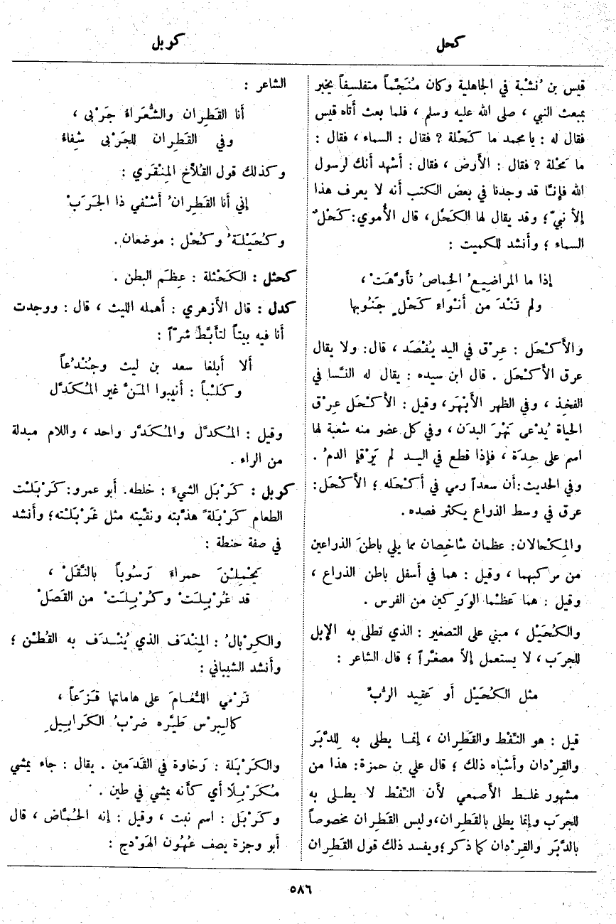 ؛ الأَكْحَل: عِرْقٌ فِي وسط الذراع يَكْثُرُ فَصْدُهُ. والمِكْحالان: عَظْمَانِ شاخِصان مِمَّا يَلِي باطنَ الذِّرَاعَيْنِ مِنْ مَرْكِبِهِمَا، وَقِيلَ: هُمَا فِي أَسفل بَاطِنِ الذِّرَاعِ، وَقِيلَ: هُمَا عَظْما الوَرِكين مِنَ الْفَرَسِ. والكُحَيْل، مَبْنِيٌّ عَلَى التَّصْغِيرِ: الَّذِي تُطْلَى بِهِ الإِبل للجرَب، لَا يُسْتَعْمَلُ إِلَّا مصغَّراً؛ قَالَ الشَّاعِرُ: