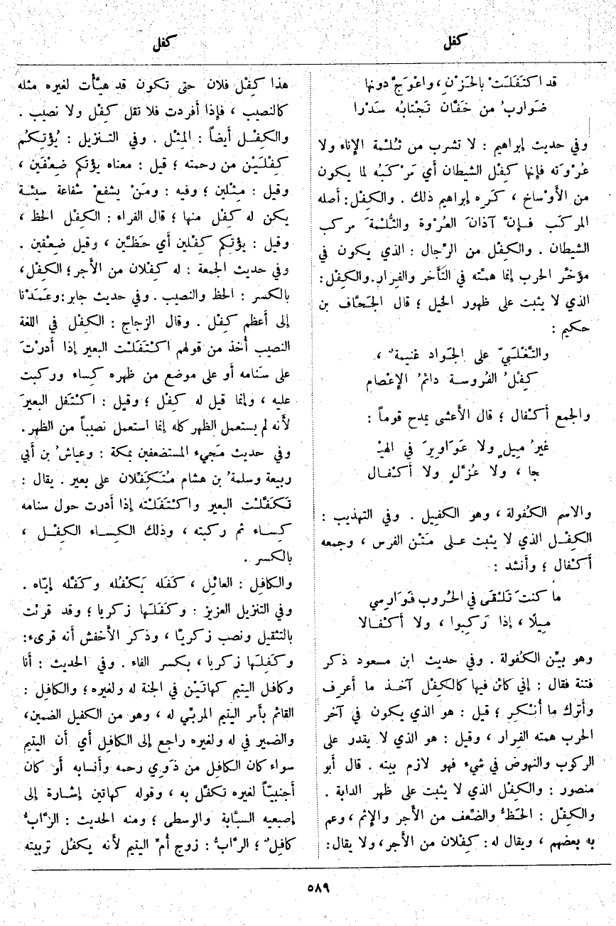 ؛ قِيلَ: هُوَ الَّذِي يَكُونُ فِي آخِرِ الْحَرْبِ هِمَّتُهُ الفِرار، وَقِيلَ: هُوَ الَّذِي لَا يَقْدِرُ عَلَى الرُّكُوبِ وَالنُّهُوضِ فِي شَيْءٍ فَهُوَ لَازِمُ بَيْتِهِ. قَالَ أَبو مَنْصُورٍ: والكِفْل الَّذِي لَا يُثْبَتُ عَلَى ظَهْرِ الدَّابَّةِ. والكِفْل: الحَظُّ والضِّعف مِنَ الأَجر والإِثم، وَعَمَّ بِهِ بَعْضُهُمْ، وَيُقَالُ لَهُ: كِفْلان مِنَ الأَجر، وَلَا يُقَالُ: هَذَا كِفْل فُلَانٍ حَتَّى تَكُونَ قَدْ هيَّأْت لِغَيْرِهِ مِثْلَهُ كَالنَّصِيبِ، فإِذا أَفردت فَلَا تَقُلْ كِفْل وَلَا نَصِيبٌ. والكِفْل أَيضاً: المِثْل. وَفِي التَّنْزِيلِ: يُؤْتِكُمْ كِفْلَيْنِ مِنْ رَحْمَتِهِ