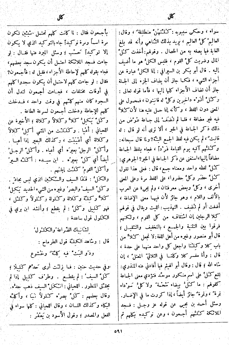 ، وَعَنْ تَوْكِيدِهِ بِكُلِّهِمْ ثُمَّ بأَجمعون فَقَالَ: لَمَّا كَانَتْ كُلُّهُمْ تَحْتَمِلُ شَيْئَيْنِ تَكُونُ مَرَّةً اسْمًا ومرة توكيداً جاء بالتوكيد الَّذِي لَا يَكُونُ إِلا تَوْكِيدًا حَسْب؛ وَسُئِلَ الْمُبَرِّدُ عَنْهَا فَقَالَ: لَوْ جَاءَتْ فَسَجَدَ الْمَلائِكَةُ* احْتَمَلَ أَن يَكُونَ سَجَدَ بَعْضُهُمْ، فَجَاءَ بِقَوْلِهِ كُلُّهُمْ* لإِحاطة الأَجزاء، فَقِيلَ لَهُ: فأَجمعون؟ فَقَالَ: لَوْ جَاءَتْ كُلُّهُمْ لَاحْتَمَلَ أَن يَكُونَ سَجَدُوا كُلُّهُمْ فِي أَوقات مُخْتَلِفَاتٍ، فَجَاءَتْ أَجمعون لِتَدُلَّ أَن السُّجُودَ كَانَ مِنْهُمْ كلِّهم فِي وَقْتٍ وَاحِدٍ، فَدَخَلَتْ كُلُّهُمْ للإِحاطة وَدَخَلَتْ أَجمعون لِسُرْعَةِ الطَّاعَةِ. وكَلَّ يَكِلُّ كَلًّا وكَلالًا وكَلالة؛ الأَخيرة عَنِ اللِّحْيَانِيِّ: أَعْيا. وكَلَلْت مِنَ الْمَشْيِ أَكِلُّ كَلالًا وكَلالة أَي أَعْيَيْت، وَكَذَلِكَ الْبَعِيرُ إِذا أَعيا. وأَكَلَّ الرجلُ بعيرَه أَي أَعياه. وأَكَلَّ الرجلُ أَيضاً أَي كَلَّ بعيرُه. ابْنُ سِيدَهْ: أَكَلَّه السيرُ وأَكَلَّ القومُ كَلَّت إِبلُهم. والكَلُّ: قَفَا السَّيْفِ والسِّكِّين الَّذِي لَيْسَ بحادٍّ. وكَلَّ السيفُ والبصرُ وَغَيْرُهُ مِنَ الشَّيْءِ الْحَدِيدِ يَكِلُّ كَلًّا وكِلَّة وكَلالة وكُلُولة وكُلولًا وكَلَّل، فَهُوَ كَلِيل وكَلٌّ: لَمْ يَقْطَعْ؛ وأَنشد ابْنُ بَرِّيٍّ فِي الكُلول قَوْلَ سَاعِدَةَ:
