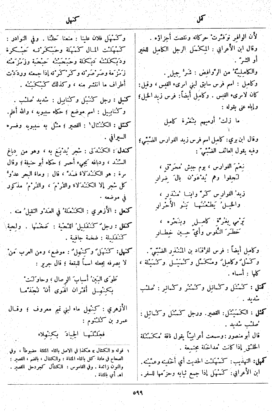 كنهل: كَنْهَلٌ وكِنْهِلٌ: مَوْضِعٌ، وَمِنَ الْعَرَبِ مَنْ لَا يَصْرِفُهُ يَجْعَلُهُ اسْمًا لِلْبُقْعَةِ؛ قَالَ جَرِيرٌ: