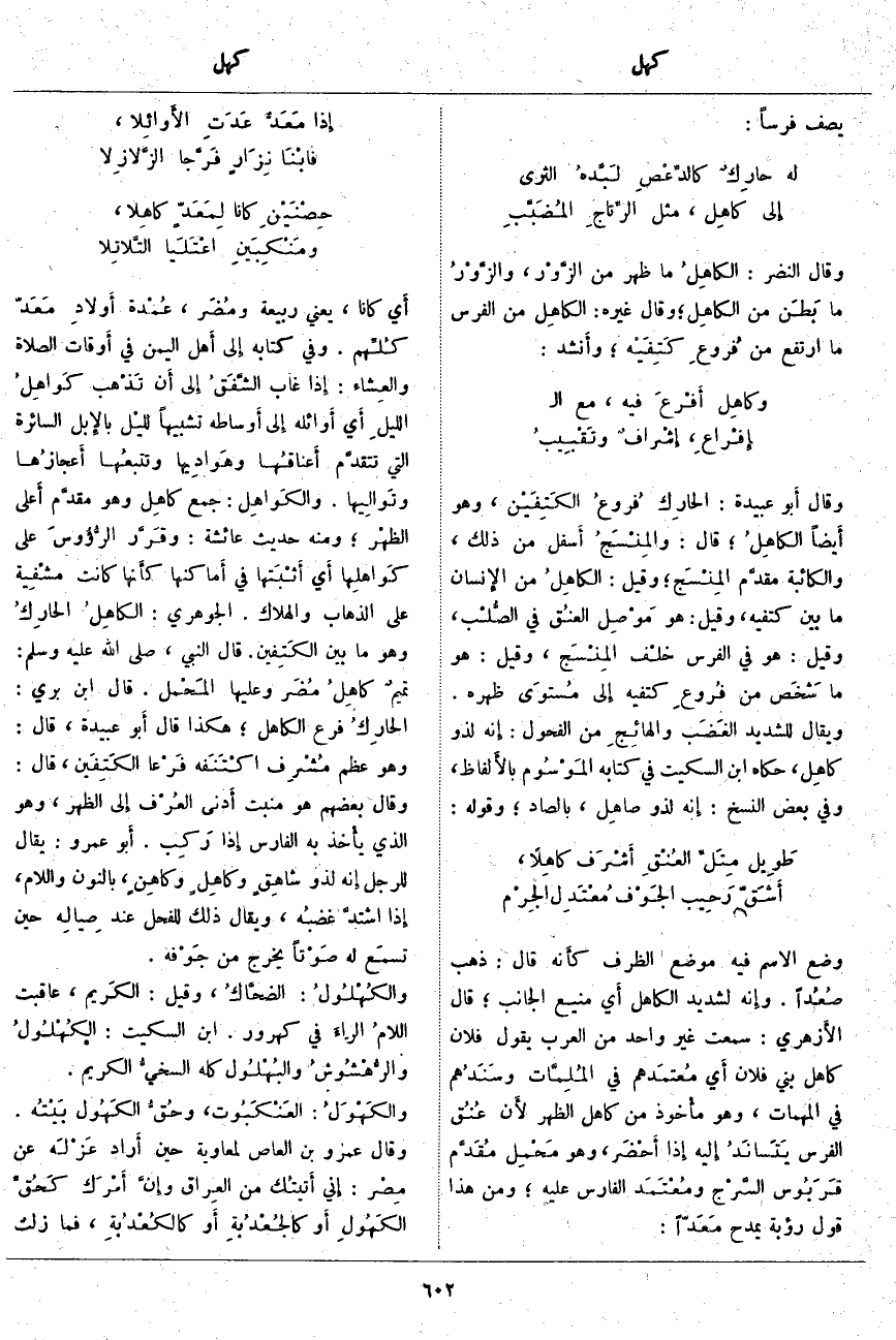 قَالَ ابْنُ بَرِّيٍّ: الحارِكُ فَرْعُ الْكَاهِلِ؛ هَكَذَا قَالَ أَبو عُبَيْدَةَ، قَالَ: وَهُوَ عَظْمٌ مُشْرِف اكْتَنَفَه فَرْعا الكَتِفَين، قَالَ: وَقَالَ بَعْضُهُمْ هُوَ مَنْبَتُ أَدنى العُرْف إِلى الظَّهْرِ، وَهُوَ الَّذِي يأْخذ بِهِ الْفَارِسُ إِذا رَكِب. أَبو عَمْرٍو: يُقَالُ لِلرَّجُلِ إِنه لَذُو شاهِقٍ وكاهِلٍ وكاهِنٍ، بِالنُّونِ وَاللَّامِ، إِذا اشتدَّ غضبُه، وَيُقَالُ ذَلِكَ لِلْفَحْلِ عِنْدَ صِيالِه حِينَ تسمَع لَهُ صَوْتاً يَخْرُجُ مِنْ جَوْفه. والكُهْلُولُ: الضحَّاكُ، وَقِيلَ: الكَريم، عَاقَبَتِ اللامُ الراءَ فِي كُهْرُورٍ. ابْنُ السِّكِّيتِ: الكُهْلُولُ والرُّهْشُوشُ والبُهْلُول كُلُّهُ السخيُّ الْكَرِيمُ. والكَهْوَلُ: العَنْكَبُوت، وحُقُّ الكَهُول بَيْتُه. وَقَالَ عَمْرُو بْنُ الْعَاصِ لِمُعَاوِيَةَ حِينَ أَراد عَزْلَه عَنْ مِصْر: إِني أَتيتُك مِنَ العِراق وإِنَّ أَمْرَك كَحُقِّ الكَهُولِ أَو كالجُعْدُبةِ أَو كالكُعْدُبةِ، فَمَا زِلْتُ