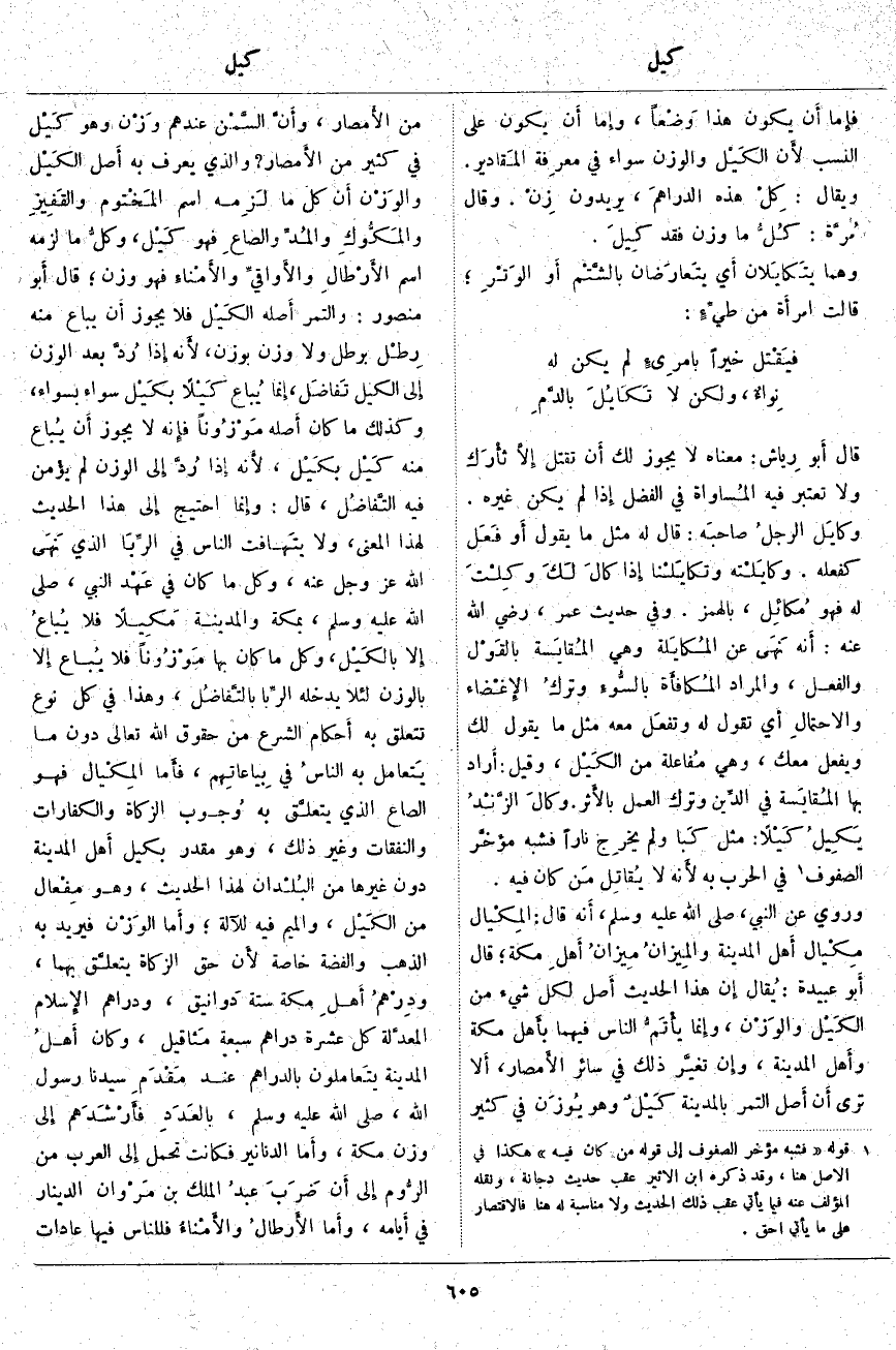 ؛ قَالَ أَبو عُبَيْدَةَ: يُقال إِن هَذَا الْحَدِيثَ أَصل لِكُلِّ شَيْءٍ مِنَ الكَيْل والوَزْن، وإِنما يأْتَمُّ النَّاسُ فِيهِمَا بأَهل مَكَّةَ وأَهل الْمَدِينَةِ، وإِن تغيَّر ذَلِكَ فِي سَائِرِ الأَمصار، أَلا تَرَى أَن أَصل التَّمْرِ بِالْمَدِينَةِ كَيْلٌ وَهُوَ يُوزَن فِي كَثِيرٍ مِنَ الأَمصار، وأَنَّ السَّمْن عِنْدَهُمْ وَزْن وَهُوَ كَيْل فِي كَثِيرٍ مِنَ الأَمصار؟ وَالَّذِي يُعْرَفُ بِهِ أَصل الكَيْل والوَزْن أَن كُلَّ مَا لَزِمه اسْمُ المَخْتوم والقَفِيزِ والمَكُّوكِ والمُدِّ والصاعِ فَهُوَ كَيْل، وكلُّ مَا لَزِمَهُ اسْمُ الأَرْطالِ والأَواقيِّ والأَمْناءِ فَهُوَ وَزْنٌ؛ قَالَ أَبو مَنْصُورٍ: وَالتَّمْرُ أَصله الكَيْل فَلَا يَجُوزُ أَن يُبَاعَ مِنْهُ رِطْل بِرِطْلٍ وَلَا وَزْنٌ بِوَزْنٍ، لأَنه إِذا رُدَّ بَعْدَ الْوَزْنِ إِلى الْكَيْلِ تَفاضَل، إِنما يُباع كَيْلًا بكَيْل سَوَاءً بِسَوَاءٍ، وَكَذَلِكَ مَا كَانَ أَصله مَوْزُوناً فإِنه لَا يَجُوزُ أَن يُباع مِنْهُ كَيْل بكَيْل، لأَنه إِذا رُدَّ إِلى الْوَزْنِ لَمْ يؤْمن فِيهِ التَّفاضُل، قَالَ: وإِنما احْتِيجَ إِلى هَذَا الْحَدِيثِ لِهَذَا الْمَعْنَى، وَلَا يتَهافت النَّاسُ فِي الرِّبَا الَّذِي نَهَى اللَّهُ عَزَّ وَجَلَّ عَنْهُ، وَكُلُّ مَا كَانَ فِي عَهْد النَّبِيِّ، صَلَّى اللَّهُ عَلَيْهِ وَسَلَّمَ، بِمَكَّةَ والمدينة مَكِيلًا فَلَا يُباعُ إِلا بالكَيْل، وَكُلُّ مَا كَانَ بِهَا مَوْزُوناً فَلَا يُباع إِلا بِالْوَزْنِ لِئَلَّا يَدْخُلَهُ الرِّبا بالتَّفاضُل، وَهَذَا فِي كُلِّ نَوْعٍ تَتَعَلَّقُ بِهِ أَحكام الشَّرْعِ مِنْ حُقُوقِ اللَّهِ تَعَالَى دُونَ مَا يَتعامل بِهِ الناسُ فِي بِياعاتِهم، فأَما المِكْيال فَهُوَ الصَّاعُ الَّذِي يتعلَّق بِهِ وُجوب الزَّكَاةِ وَالْكَفَّارَاتِ وَالنَّفَقَاتِ وَغَيْرِ ذَلِكَ، وَهُوَ مُقَدَّرٌ بِكَيْلِ أَهل الْمَدِينَةِ دُونَ غَيْرِهَا مِنَ البُلْدان لِهَذَا الْحَدِيثِ، وَهُوَ مِفْعال مِنَ الكَيْل، وَالْمِيمُ فِيهِ لِلْآلَةِ؛ وأَما الوَزْن فَيُرِيدُ بِهِ الذَّهَبَ وَالْفِضَّةَ خَاصَّةً لأَن حَقَّ الزَّكَاةِ يتعلَّق بِهِمَا، ودِرْهمُ أَهلِ مَكَّةَ سِتَّةُ دَوانيق، وَدَرَاهِمُ الإِسلام المعدَّلة كُلُّ عَشَرَةِ دَرَاهِمَ سَبْعَةُ مَثاقيل، وَكَانَ أَهلُ الْمَدِينَةِ يتَعاملون بِالدَّرَاهِمِ عِنْدَ مَقْدَمِ سيدنا رسول الله، صلى اللَّهُ عَلَيْهِ وَسَلَّمَ، بالعَدَدِ فأَرْشَدَهم إِلى وَزْنِ مَكَّةَ، وأَما الدَّنَانِيرُ فَكَانَتْ تُحْمَلُ إِلى الْعَرَبِ مِنَ الرُّوم إِلى أَن ضَرَبَ عبدُ الْمَلِكِ بْنَ مَرْوان الدِّينَارَ فِي أَيامه، وأَما الأَرطالُ والأَمْناءُ فَلِلنَّاسِ فِيهَا عَادَاتٌ