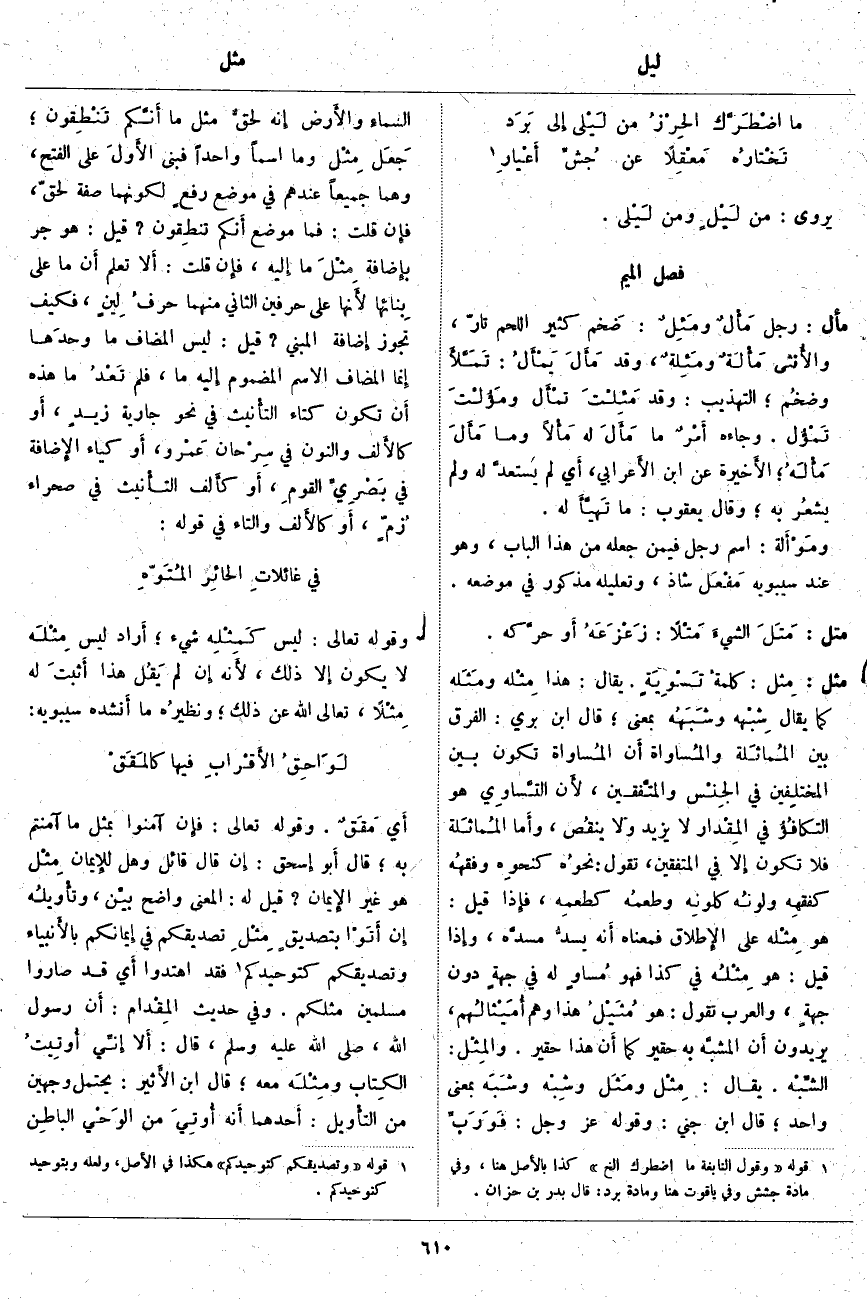 مثل: مِثل: كلمةُ تَسْوِيَةٍ. يُقَالُ: هَذَا مِثْله ومَثَله كَمَا يُقَالُ شِبْهه وشَبَهُه بِمَعْنًى؛ قَالَ ابْنُ بَرِّيٍّ: الْفَرْقُ بَيْنَ المُمَاثَلَة والمُساواة أَن المُساواة تَكُونُ بَيْنَ المختلِفين فِي الجِنْس والمتَّفقين، لأَن التَّساوِي هُوَ التكافُؤُ فِي المِقْدار لَا يَزِيدُ وَلَا ينقُص، وأَما المُمَاثَلَة فَلَا تَكُونُ إِلا فِي الْمُتَّفِقِينَ، تَقُولُ: نحوُه كنحوِه وفقهُه كفقهِه ولونُه كلونِه وطعمُه كطعمِه، فإِذا قِيلَ: هُوَ مِثْله عَلَى الإِطلاق فَمَعْنَاهُ أَنه يسدُّ مسدَّه، وإِذا قِيلَ: هُوَ مِثْلُه فِي كَذَا فَهُوَ مُساوٍ لَهُ فِي جهةٍ دُونَ جهةٍ، وَالْعَرَبُ تَقُولُ: هُوَ مُثَيْلُ هَذَا وَهُمْ أُمَيْثَالُهم، يريدون أَن المشبَّه بِهِ حَقِيرٌ كَمَا أَن هَذَا حَقِيرٌ. والمِثْل: الشِّبْه. يُقَالُ: مِثْل ومَثَل وشِبْه وشَبَه بِمَعْنًى وَاحِدٍ؛ قَالَ ابْنُ جِنِّي: وقوله عز وجل: فَوَ رَبِّ السَّماءِ وَالْأَرْضِ إِنَّهُ لَحَقٌّ مِثْلَ مَا أَنَّكُمْ تَنْطِقُونَ