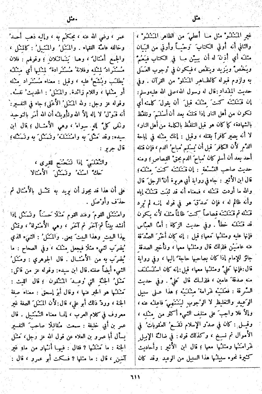 ؛ قَالَ ابْنُ الأَثير: وأَحاديث كَثِيرَةٌ نَحْوُهُ سبيلُها هَذَا السَّبِيلُ مِنَ الْوَعِيدِ وَقَدْ كَانَ عُمَرَ، رَضِيَ اللَّهُ عَنْهُ، يحكُم بِهِ، وإِليه ذَهَبَ أَحمدُ وَخَالَفَهُ عامَّة الْفُقَهَاءِ. والمَثَلُ والمَثِيلُ: كالمِثْل، وَالْجَمْعُ أَمْثالٌ، وَهُمَا يَتَماثَلانِ؛ وَقَوْلُهُمْ: فُلَانٌ مُسْتَرادٌ لمِثْلِه وفلانةُ مُسْتَرادةٌ لمِثْلِها أَي مِثْلُه يُطلَب ويُشَحُّ عَلَيْهِ، وَقِيلَ: مَعْنَاهُ مُسْتَراد مِثْله أَو مِثْلها، وَاللَّامُ زَائِدَةٌ: والمَثَلُ: الحديثُ نفسُه. وَقَوْلُهُ عَزَّ وَجَلَّ: وَلِلَّهِ الْمَثَلُ الْأَعْلى