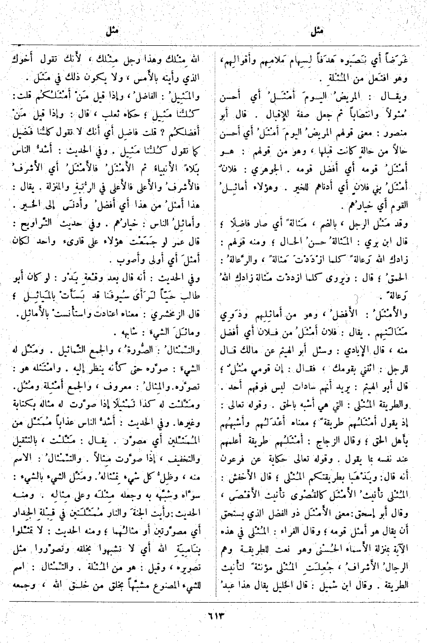 ؛ قَالَ الزَّمَخْشَرِيُّ: مَعْنَاهُ اعْتَادَتْ واستأْنستْ بالأَمَاثِل. ومَاثَلَ الشيءَ: شَابَهَهُ. والتِّمْثَالُ: الصُّورةُ، وَالْجَمْعُ التَّمَاثِيل. ومَثَّلَ لَهُ الشيءَ: صوَّره حَتَّى كأَنه يَنْظُرُ إِليه. وامْتَثَلَه هُوَ: تصوَّره. والمِثَالُ: مَعْرُوفُ، وَالْجَمْعُ أَمْثِلَة ومُثُل. ومَثَّلْتُ لَهُ كَذَا تَمْثيلًا إِذا صوَّرت لَهُ مِثَالَهُ بِكِتَابَةٍ وَغَيْرِهَا. وَفِي الْحَدِيثِ: