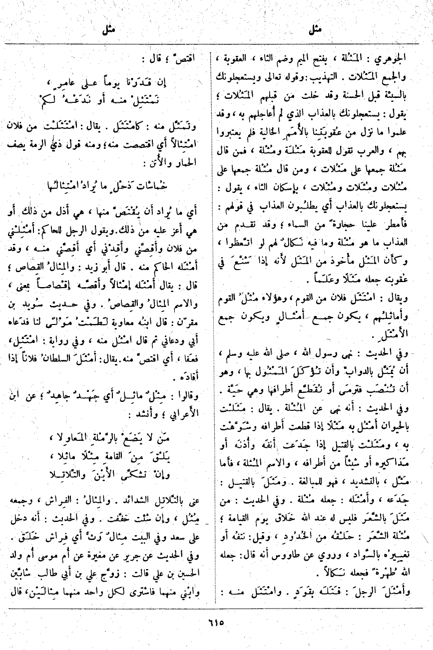 ؛ يَقُولُ: يَسْتَعْجِلُونَكَ بِالْعَذَابِ الَّذِي لَمْ أُعاجلهم بِهِ، وَقَدْ عَلِمُوا مَا نَزَلَ مِنْ عُقوبَتِنا بالأُمَمِ الْخَالِيَةِ فَلَمْ يَعْتَبِرُوا بِهِمْ، وَالْعَرَبُ تَقُولُ لِلْعُقُوبَةِ مَثُلَة ومُثْلَة فَمَنْ قَالَ مَثُلَة جَمَعَهَا عَلَى مَثُلات، وَمَنْ قَالَ مُثْلة جمعها على مُثُلات ومُثَلات ومُثْلات، بإِسكان الثَّاءِ، يَقُولُ: يَسْتَعْجِلُونَكَ بِالْعَذابِ* أَي يطلبُون الْعَذَابَ فِي قَوْلِهِمْ: فَأَمْطِرْ عَلَيْنا حِجارَةً مِنَ السَّماءِ؛ وَقَدْ تَقَدَّمَ مِنَ الْعَذَابِ مَا هُوَ مُثْلة وَمَا فِيهِ نَكالٌ لَهُمْ لَوِ اتَّعظوا، وكأَن المَثْل مأْخوذ مِنَ المَثَل لأَنه إِذا شَنَّعَ فِي عُقوبته جَعَلَهُ مَثَلًا وعَلَماً. وَيُقَالُ: امْتَثَلَ فُلَانٌ مِنَ الْقَوْمِ، وهؤُلاء مُثْلُ الْقَوْمِ وأَمَاثِلُهم، يَكُونُ جَمْعَ أَمْثالٍ وَيَكُونُ جَمْعَ الأَمْثَلِ. وَفِي الْحَدِيثِ: