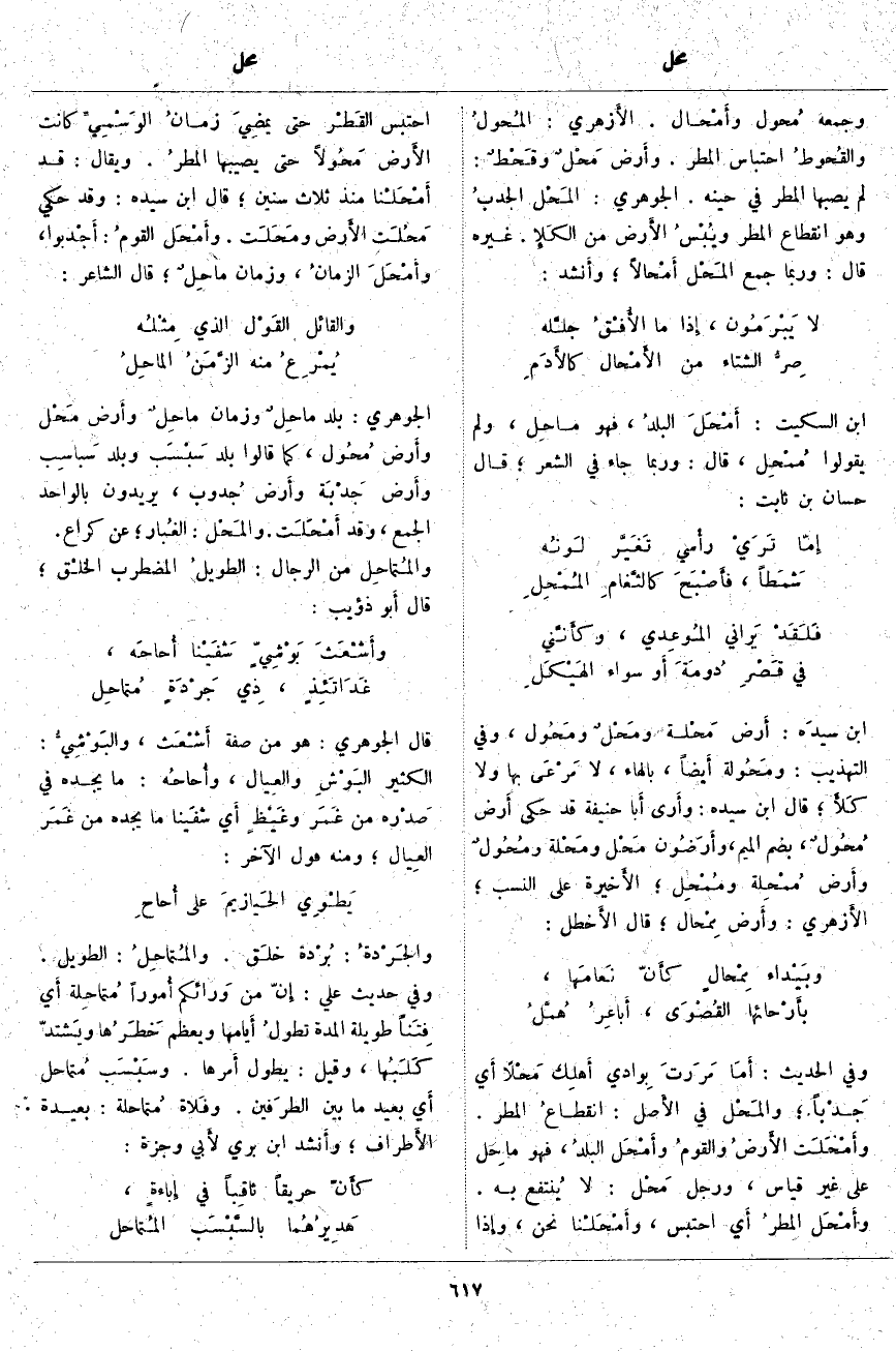ابْنُ السِّكِّيتِ: أَمْحَلَ البلدُ، هو مَاحِل، وَلَمْ يَقُولُوا مُمْحِل، قَالَ: وَرُبَّمَا جَاءَ فِي الشِّعْرِ؛ قَالَ حَسَّانُ بْنُ ثَابِتٍ:
